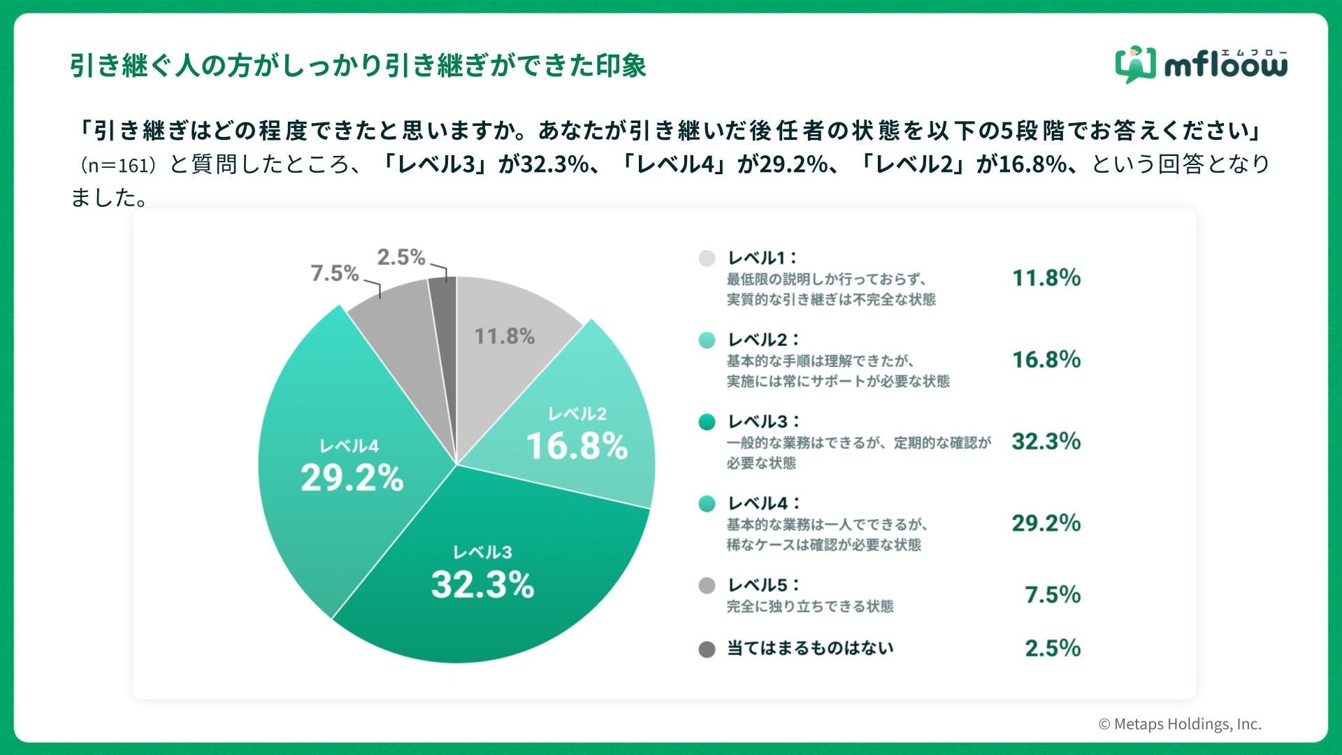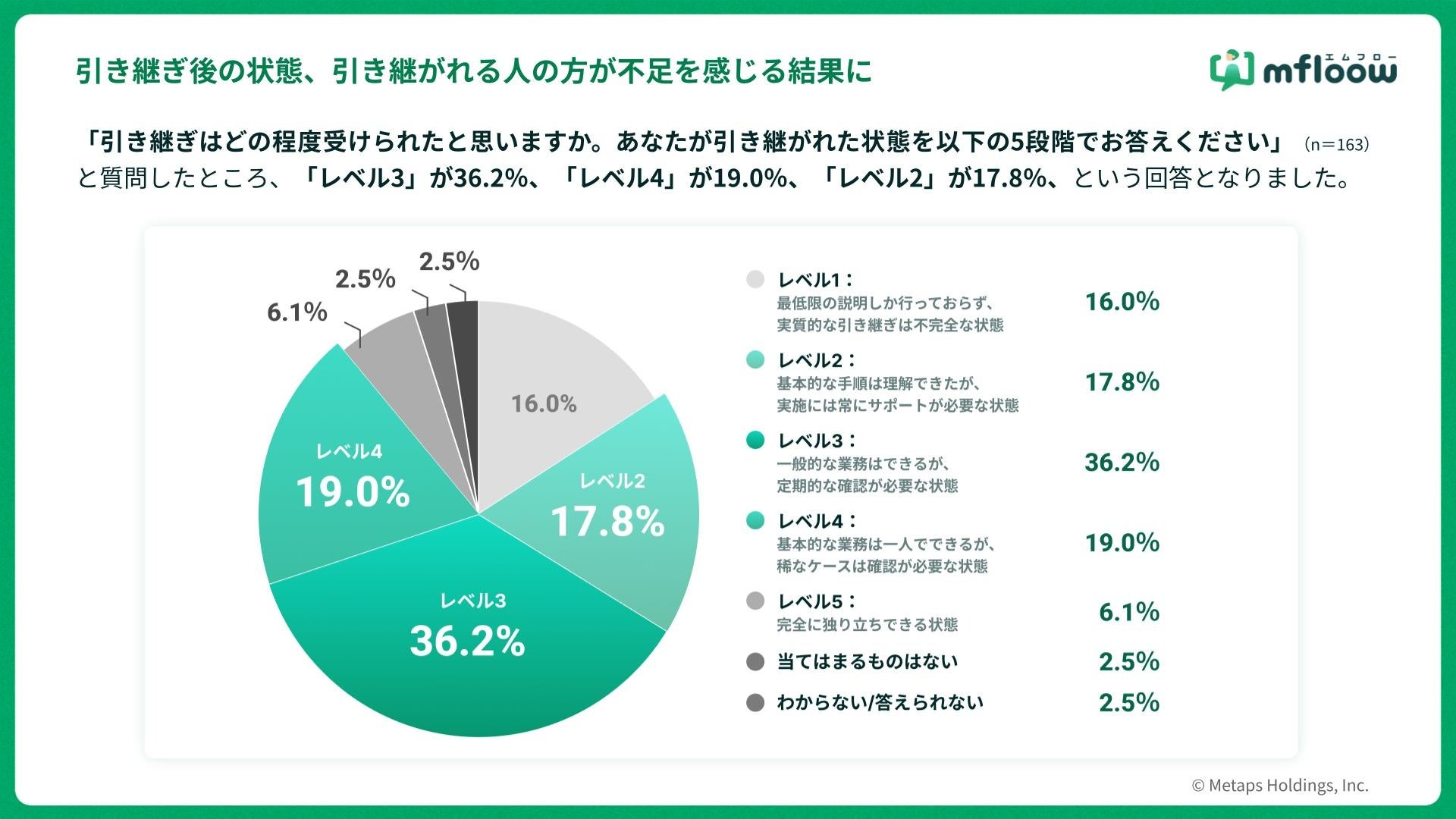 引き継ぎ後の業務理解度について質問したところ、「レベル4・5(理解度が高い)」と回答した割合は、引き継ぐ人が36.7%、引き継がれる人は25.1%にとどまり、満足度に11ポイントの差があることがわかりました。
