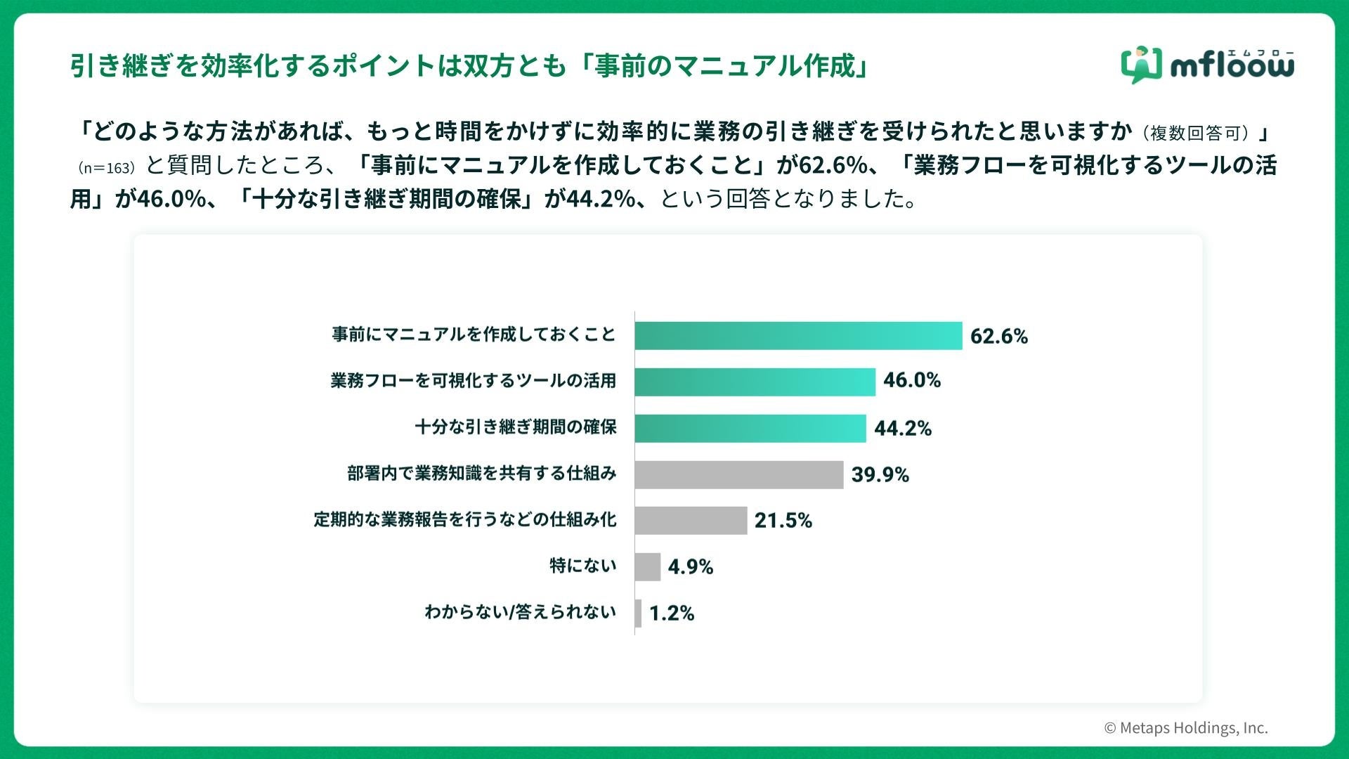 引き継ぎをより時間をかけず効率的に行う方法として、最も多く挙げられたのが「事前にマニュアルを作成しておくこと」(引き継ぐ人54.7%、引き継がれる人62.6%)。さらに、「業務フローを