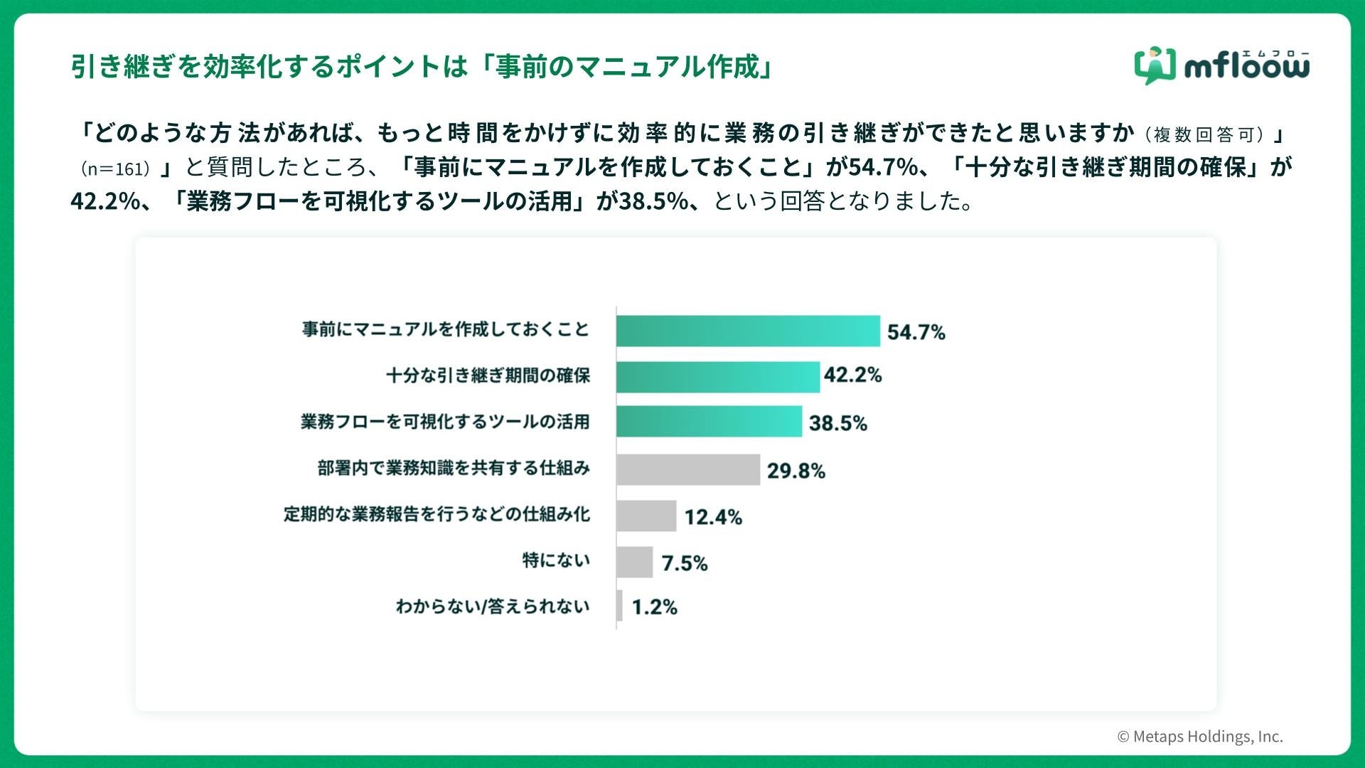 株式会社メタップスホールディングス(渋谷区、代表取締役社長 山﨑 祐一郎)が提供する従業員ライフサイクル管理ツール「mfloow(エムフロー)」は、企業のバックオフィス担当者を対象に、「引き継ぐ人」「引き継がれる人」の両方の立場から、業務の引き継ぎに関する実態調査を実施しました。