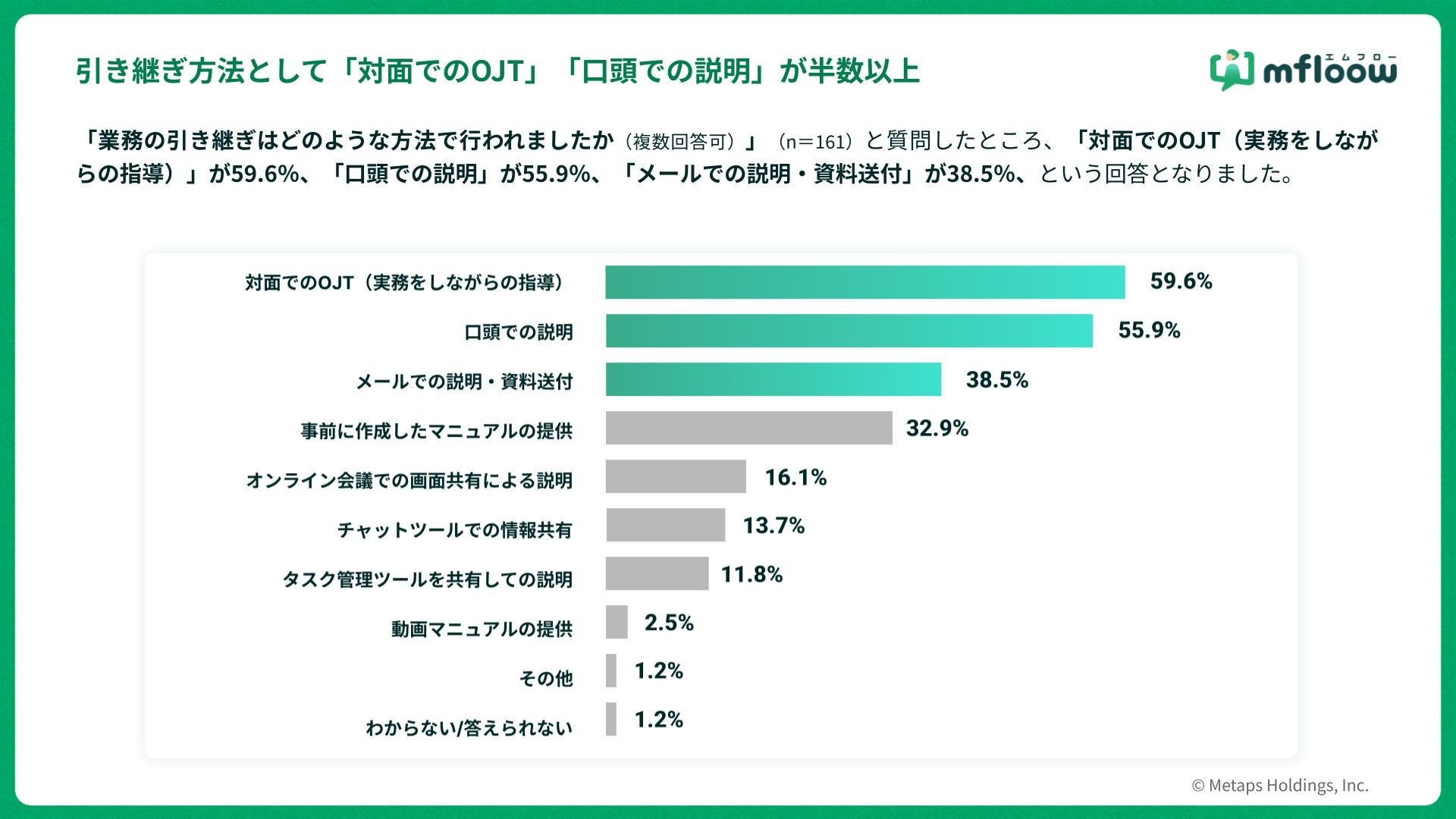 引き継ぎ方法について質問をしたところ、「対面でのOJT(実務をしながらの指導)」が最多(59.6%)、次いで「口頭での説明」(55.9%)が続きました。一方で、マニュアルを用いた引き継ぎは32.9%にとどまり、約6割が文書や資料のない状態で業務を引き継いでいることが判明しました。