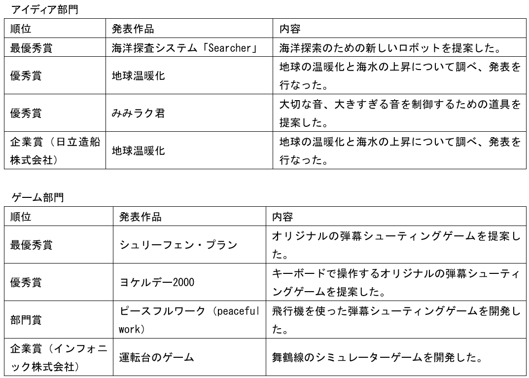 プログラミングやICTの技術を使って、地域貢献やSDGsの17の目標を達成するためのアイディアについて募集をするアイディア部門には16作品、発想力と表現力を十分に発揮して開発したゲームを募集するゲーム部門には6作品の応募がありました。