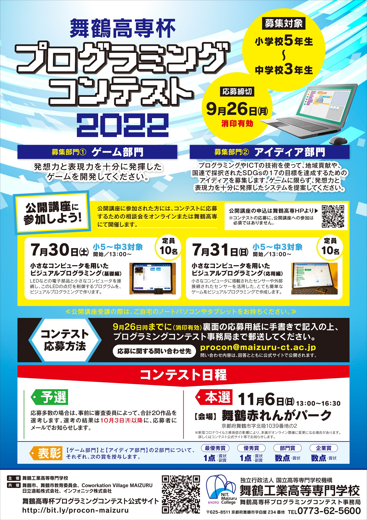 舞鶴工業高等専門学校(京都府舞鶴市 校長:内海康雄 以下「舞鶴高専」)は、主に舞鶴市周辺の小中学生を対象に、プログラミングの普及のために、小中学生の発想力、表現力、技術力および、発信力の向上を目指し、舞鶴市・舞鶴市教育委員会等との共催で、2022年11月6日(日)、舞鶴赤れんがパーク2号棟舞鶴市政記念館にて、「舞鶴高専杯プログラミングコンテスト」を開催いたしました。