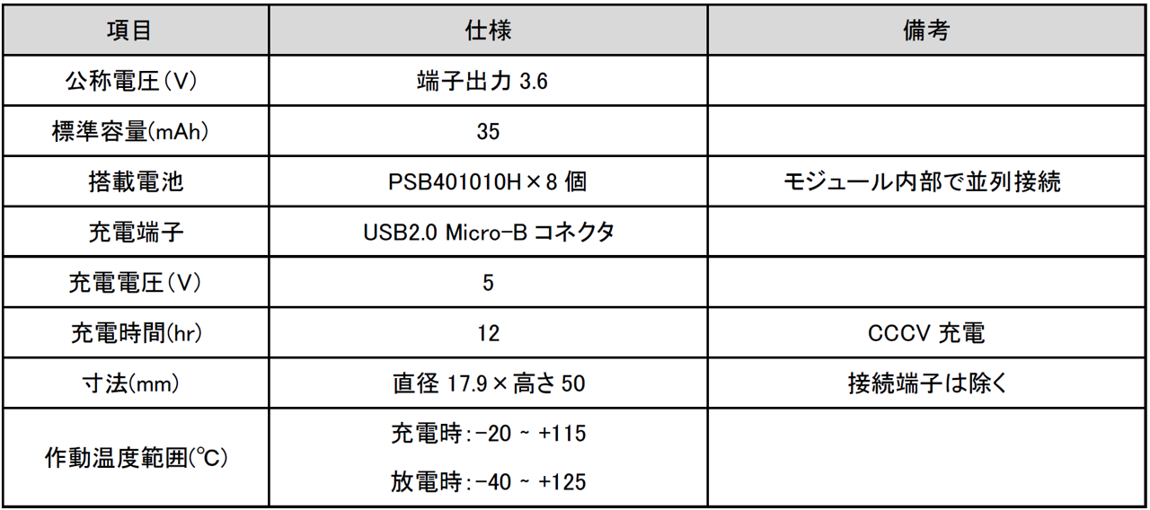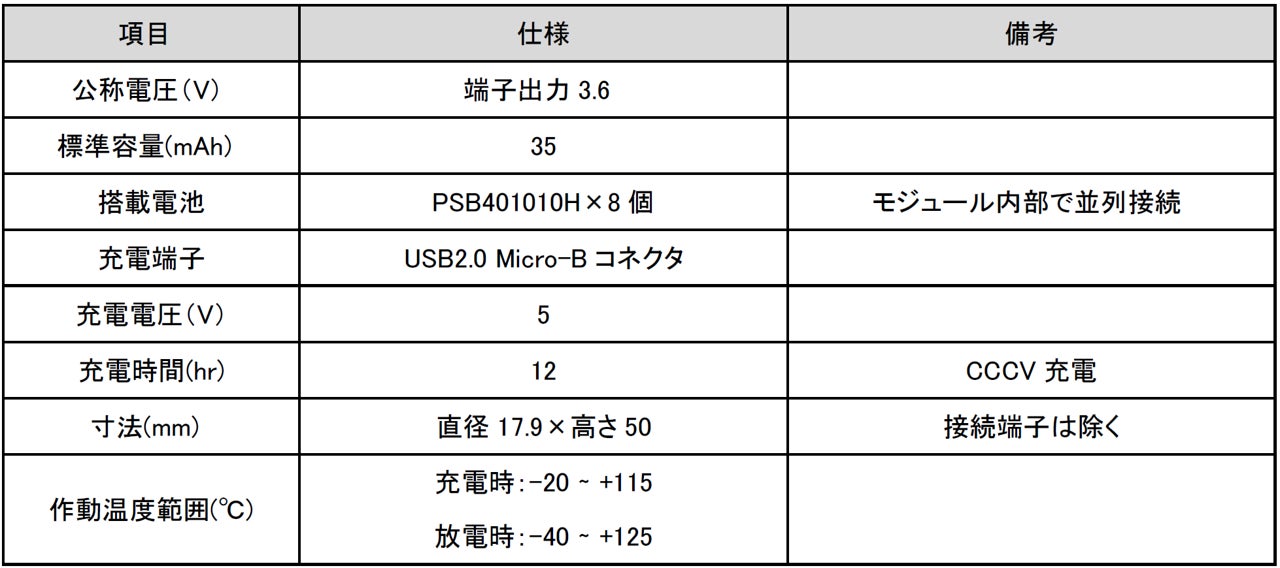 本モジュールは、現在ER電池を使用しているユーザーも容易に導入できるよう汎用的なER電池サイズ互換(直径17.9mm、高さ50mm)の筐体に、量産品の全固体電池「PSB401010H」を8個搭載することで35mAhの容量を確保するとともに、電池電圧を3.6Vに変換し、出力する回路を内蔵しています。充電に関しては、5V充電に対応しています。
