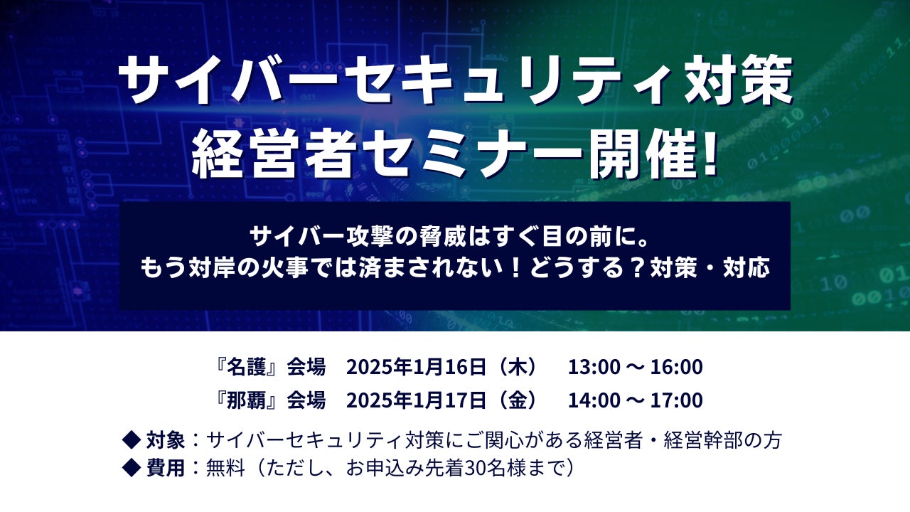 株式会社アクトは、東洋システム開発株式会社主催「サイバーセキュリティ対策 経営者セミナー」にて2025年1月16日(木)・17日(金)沖縄2会場(名護・那覇)で、無料セミナーを実施いたします。