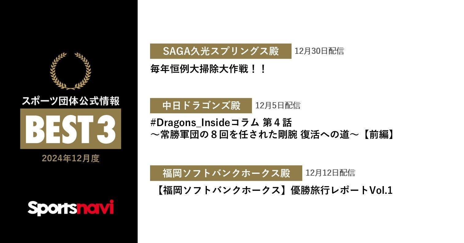 SAGA久光スプリングス、中日ドラゴンズ、福岡ソフトバンクホークスが受賞! スポーツ団体公式情報月間ベスト3(2024年12月度)