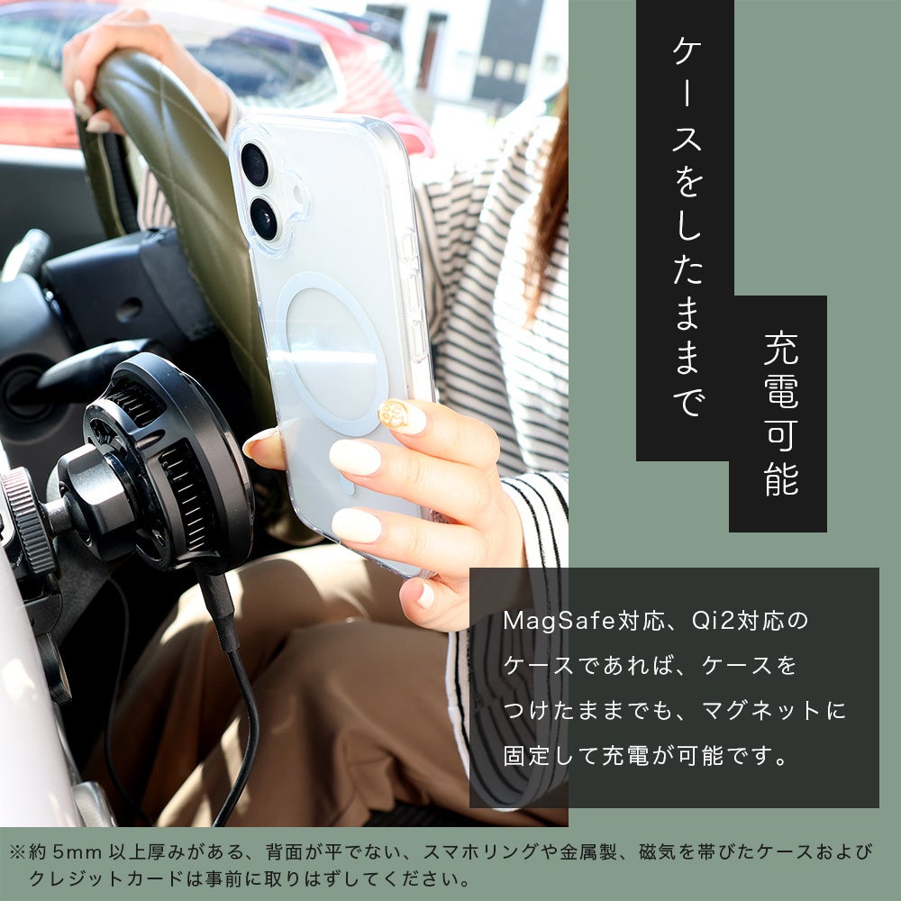 また、MagSafe対応、Qi2対応のケースであれば、ケースをつけたままでも、マグネットに固定して充電もできます。