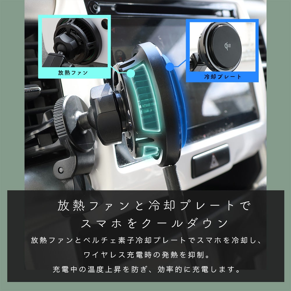 放熱ファンとペルチェ素子冷却プレートを活用し、スマホとの接合面を冷却することで、ワイヤレス充電時の発生熱を最小限に抑えています。