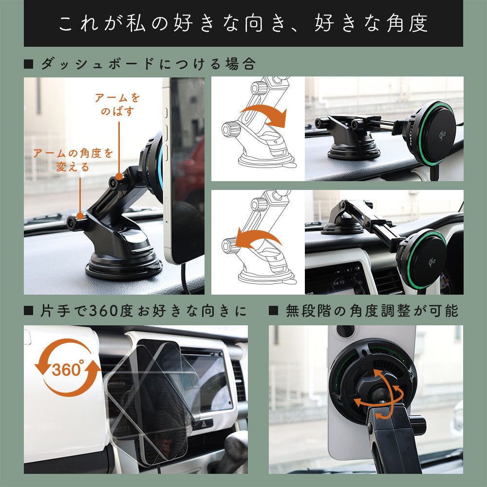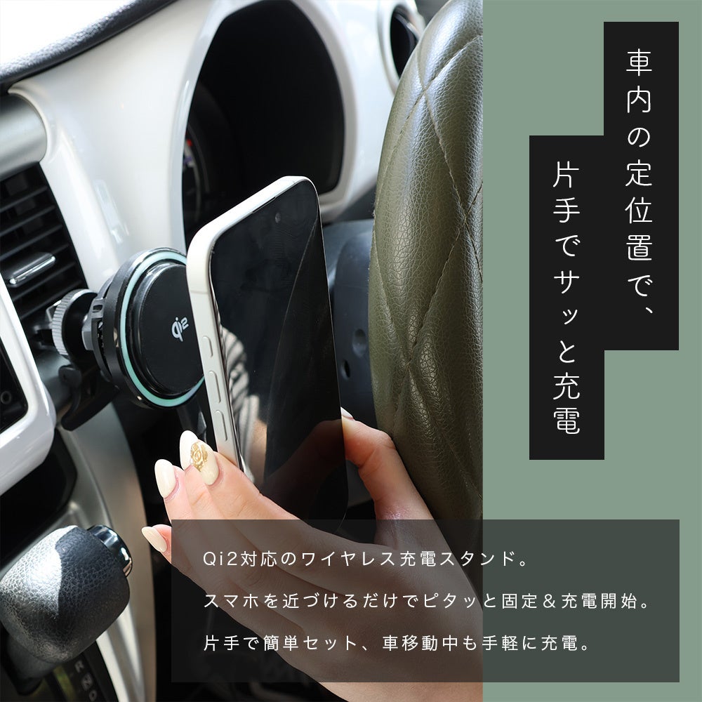 Qi2対応ワイヤレス充電可能な車用のスマホスタンドです。