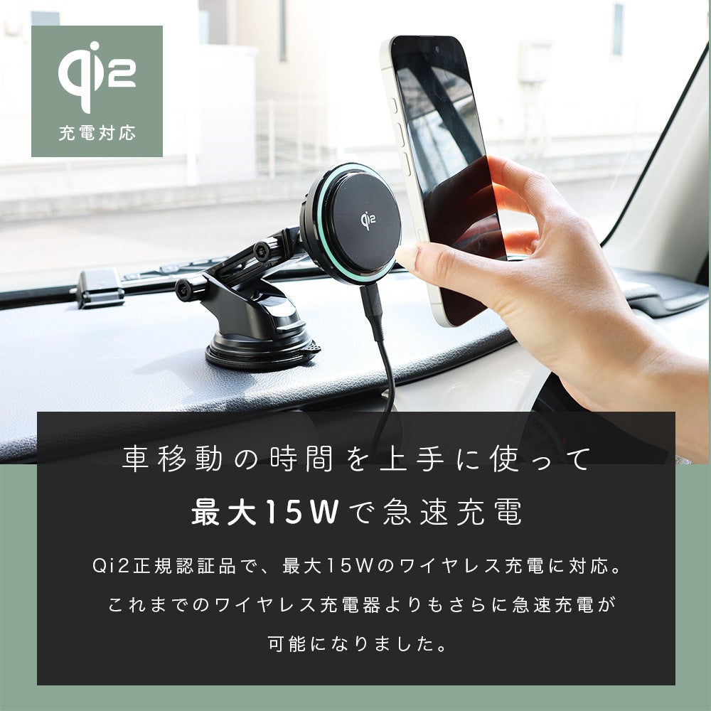 マグネット式 ワイヤレス充電器 車載 Qi2 MagSafe対応 15W 冷却ファン&冷却プレート付 シリコンケーブル付属 全1色 2年保証(MOT-QI15WCH02-EC)
