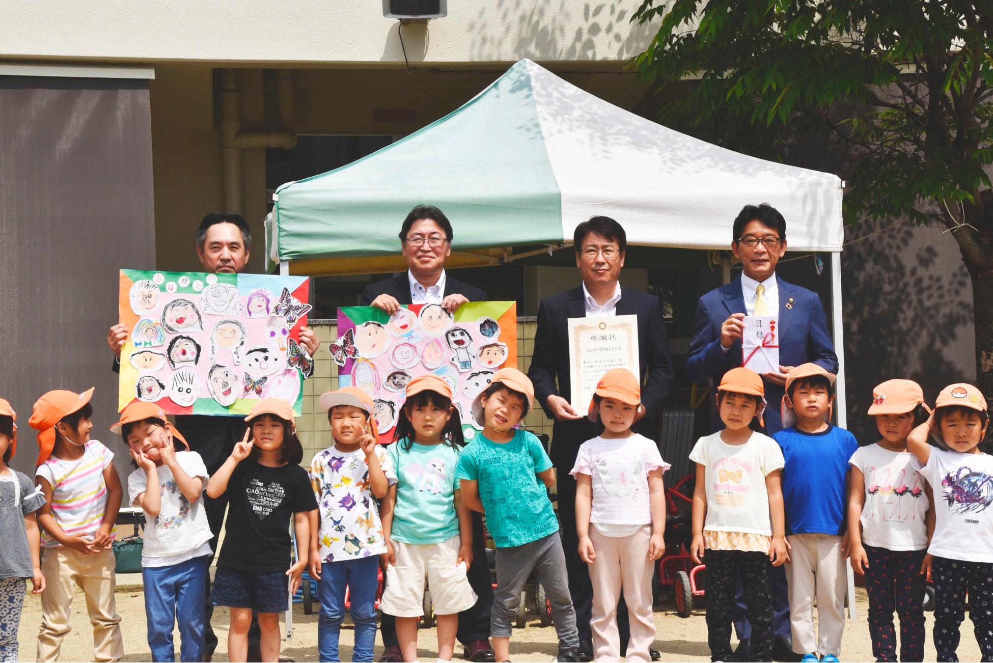 豊中市は、市立本町こども園への「スタイルシェード(外付日よけ)」の寄贈に感謝の意を表し、株式会社LIXILとAGC硝子建材株式会社に長内繁樹市長から感謝状を贈呈しました。
