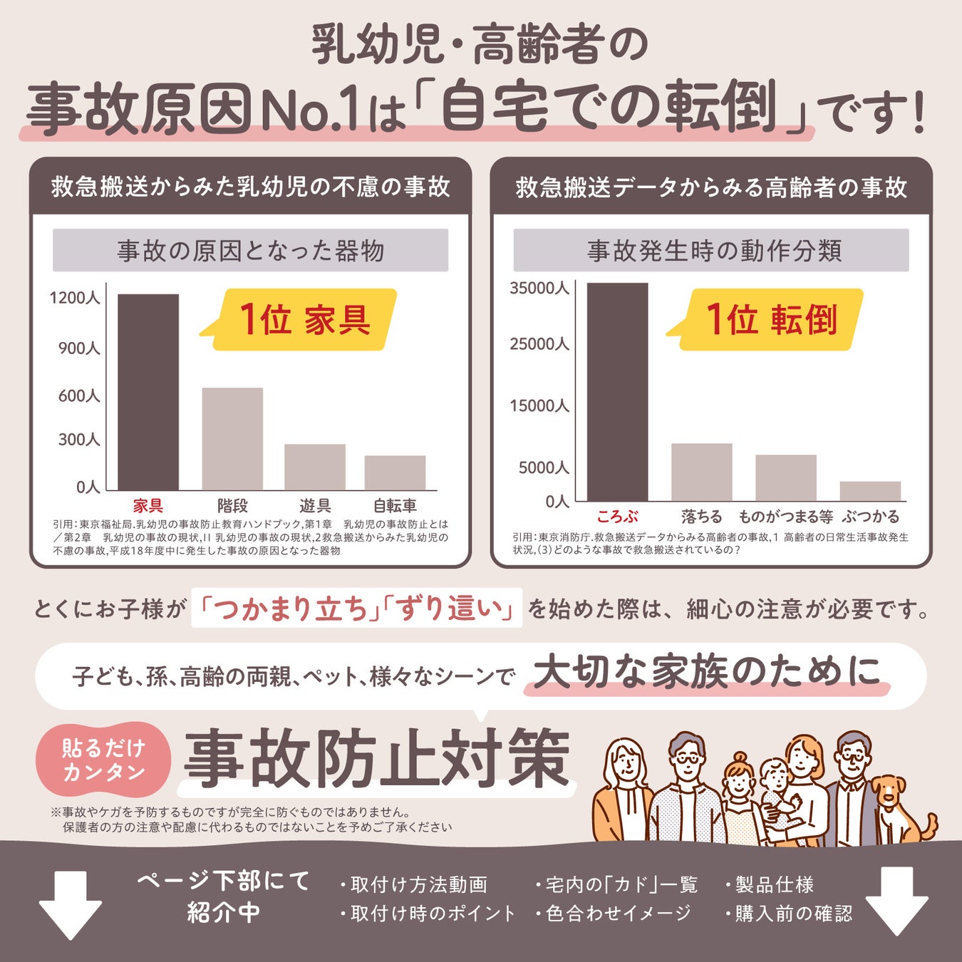 クッションの厚みは、一般的な0.8cmよりも厚い1cm仕様です。よりもっちりとした厚みで、衝撃吸収力を高めています。「つかまり立ち」や「ずり這い」を始めたお子様、足腰が弱くなった高齢者、やんちゃ盛りのペットなど、家族みんなの事故防止にお役立てください。