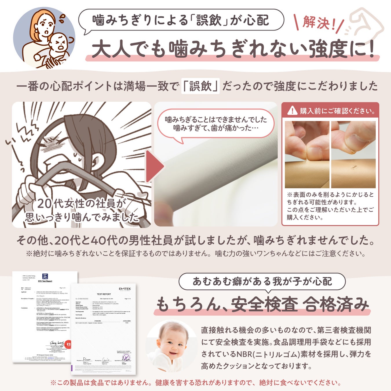 クッション性を保ちつつ、できるだけ「噛みちぎれない」強度に仕上げています。ぜひ商品が届いた際には指でつまんでみるなどお試しください。