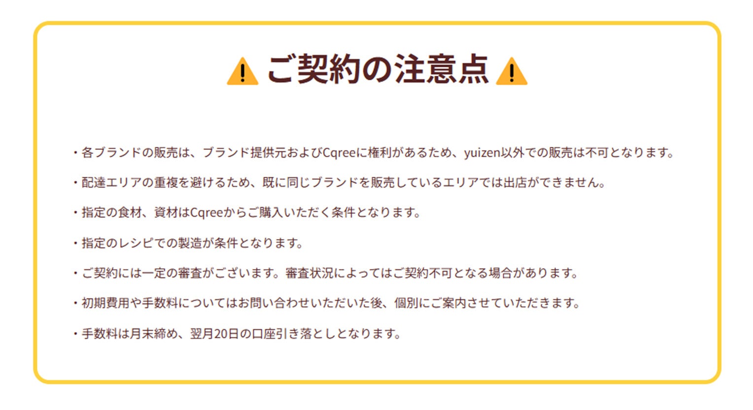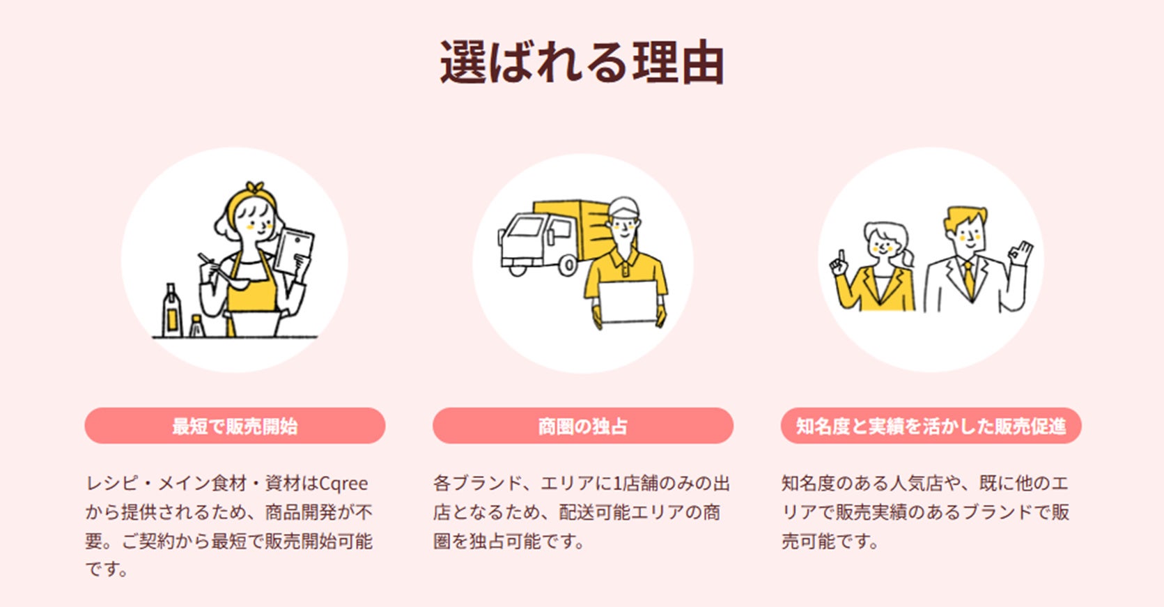 ブランド名の提供のほか、メイン食材や資材をCqreeから提供することにより、商品開発にかかる時間を大幅に短縮でき、早期に売上を作っていくことが可能なプランとなります。
