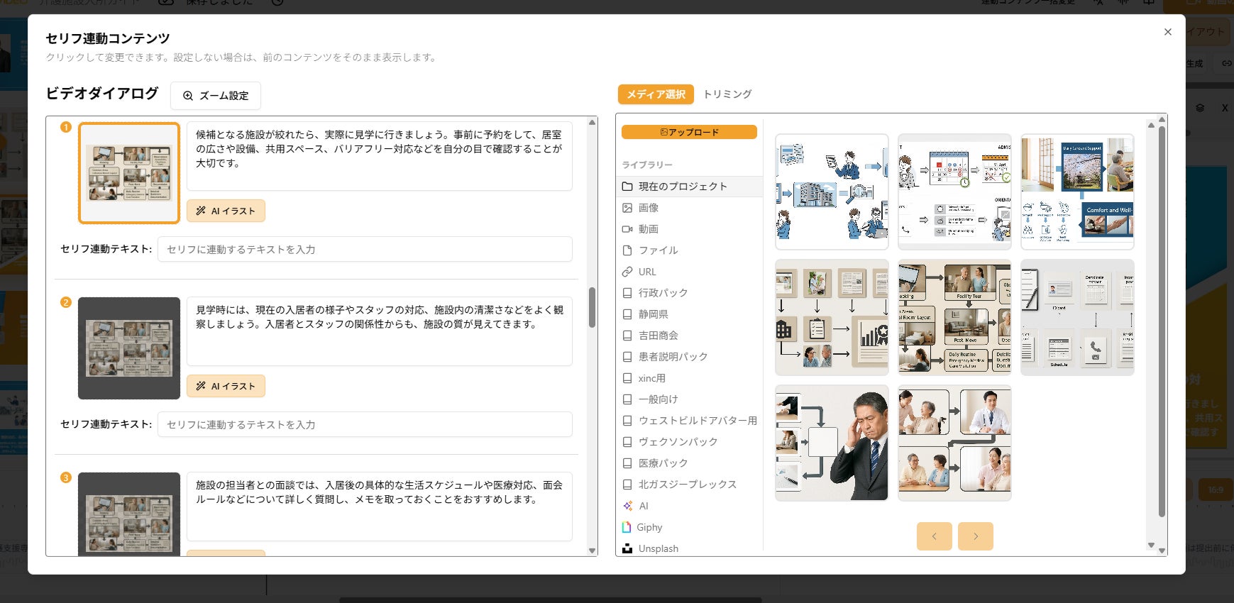 制作途中で「やっぱり図解のテイストを統一したい」「別の写真に差し替えたい」となった場合でも、セリフ連動コンテンツの導線からまとめて変更できます(編集画面上に一括変更の導線が用意されています)。