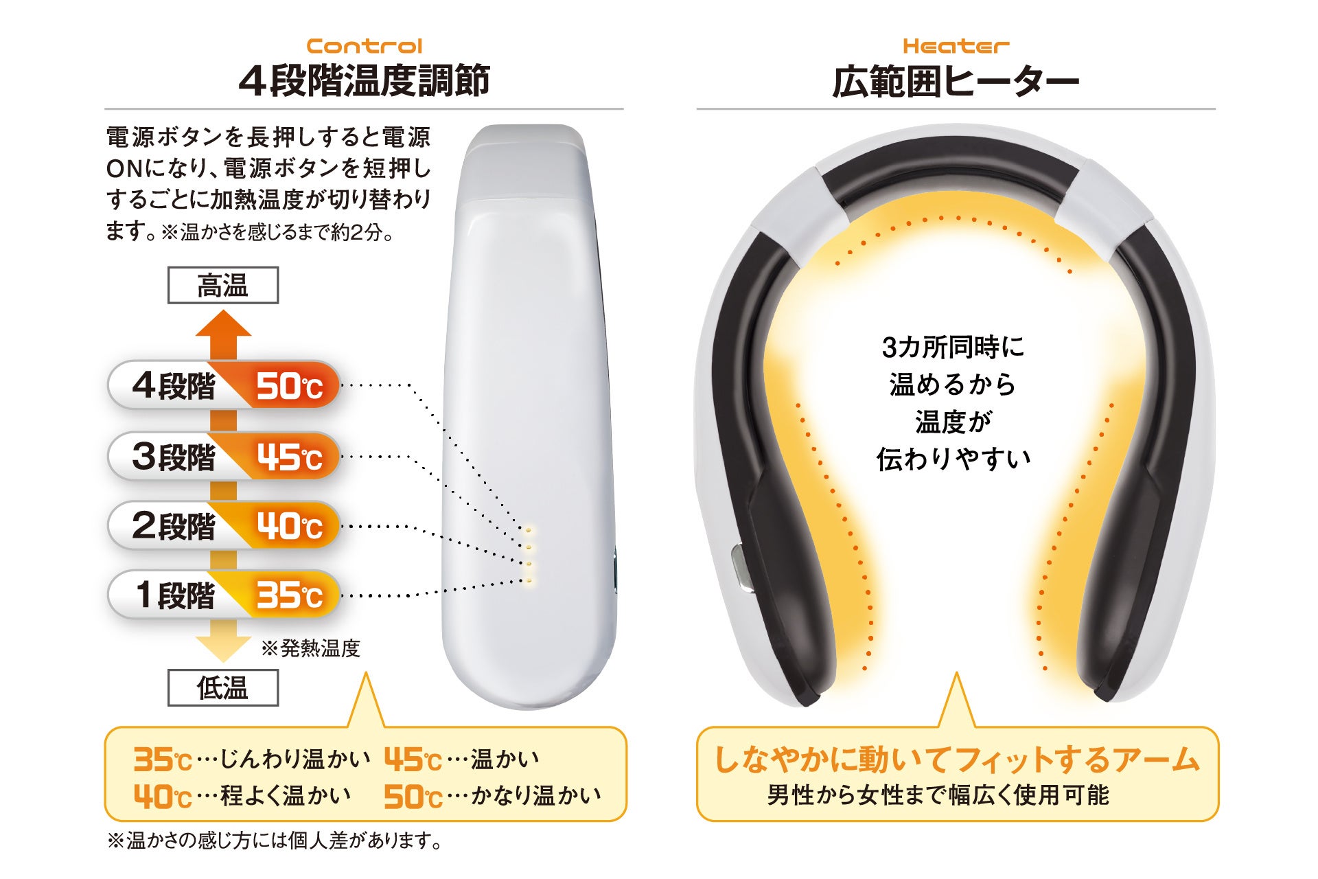 特徴:あなたの首を、4段階調節でいつでも温めてくれます。寒さから体を守るには、“3つの首”を温めるのがポイント。特に首を温めるのが重要です。寒いところでの作業時や、気温差のあるアウトドア時に最適な充電式ネックヒーターです。