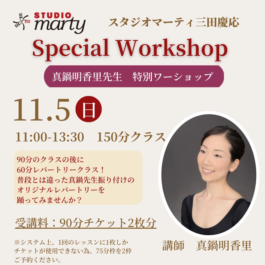 11/5(日)11:00‐13:30 150分ワークショップ スタジオマーティ三田慶応で真鍋明香里先生の特別ワークショップを開催いたします。 今回はレパートリーワークショップとなります! 90分のクラスの後に60分レパートリークラス! 普段とは違った真鍋先生振り付けのオリジナルレパートリーを踊ってみませんか? 今回は、いつもご利用いただいているチケット・プランを使用してのご受講が可能です。