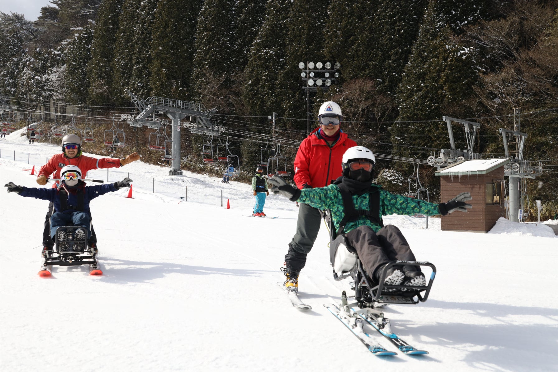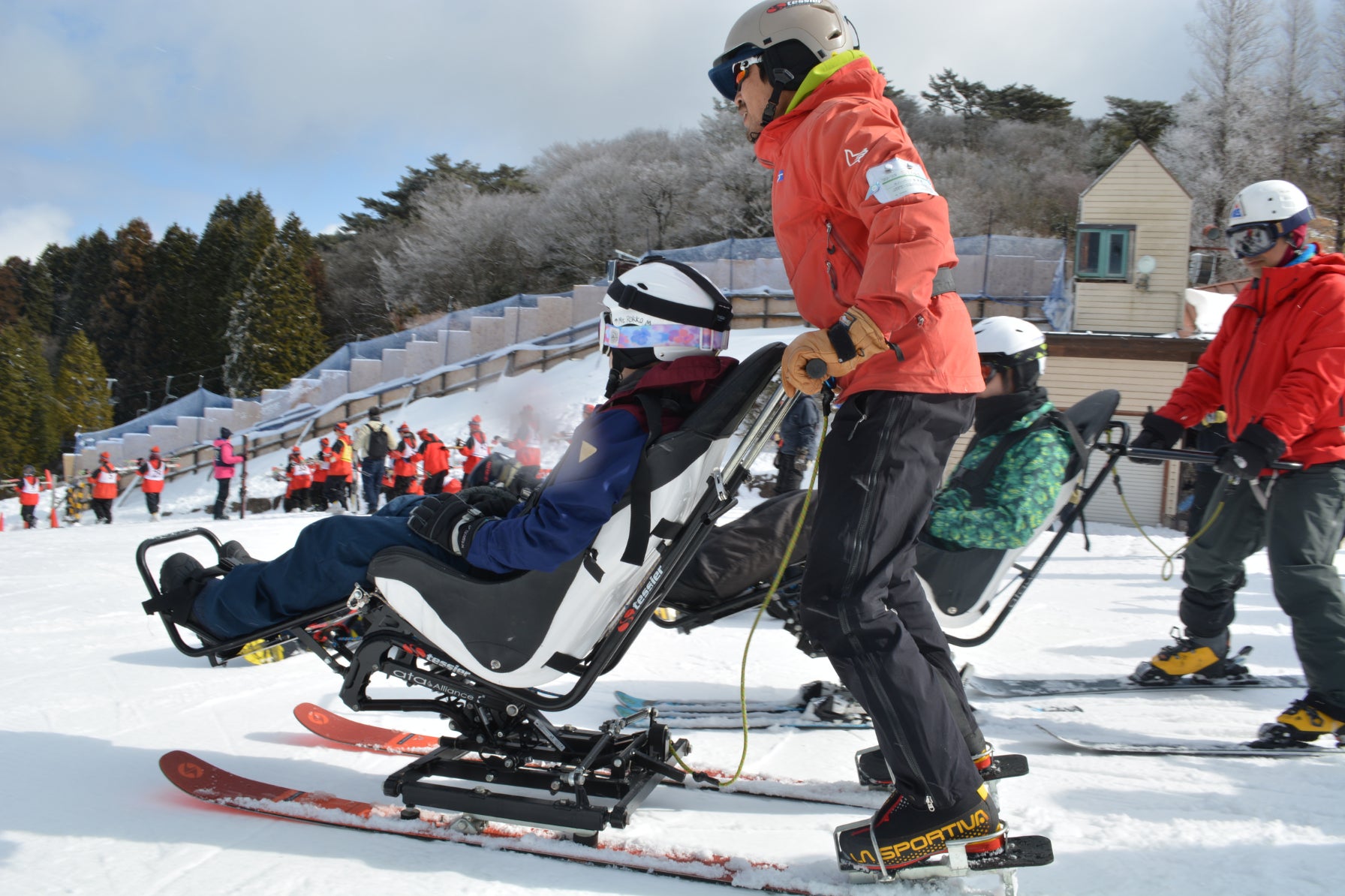『座ったまま滑れるスキー』。後ろの介助者がパイロットになり、操作します。