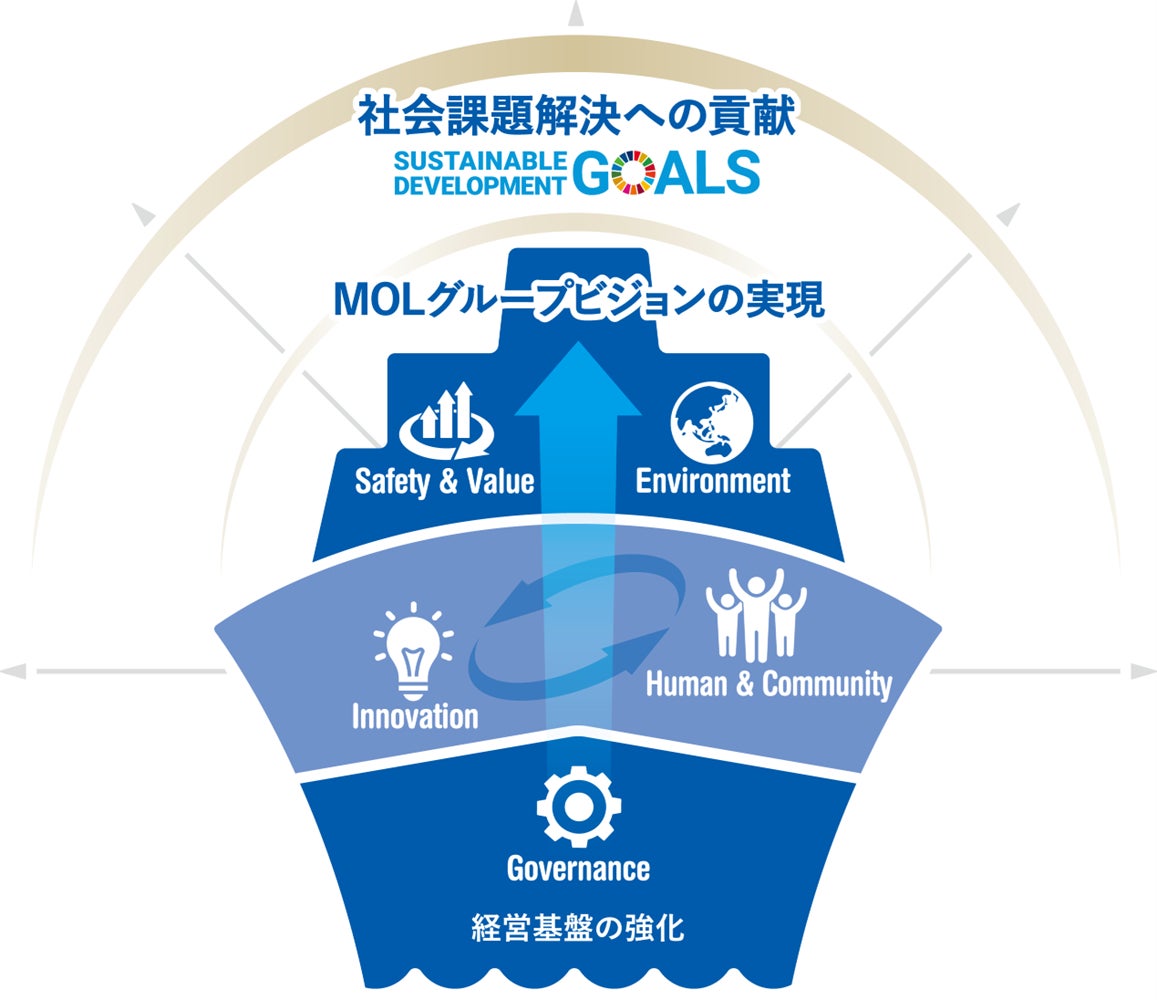 当社は、グループビジョンの実現を通じて社会と共に持続的な発展を目指すための当社グループの重要課題である「サステナビリティ課題(マテリアリティ)」を設定。2022年4月に「サステナビリティ課題(マテリアリティ)」への取り組みを加速させるため、各課題に紐づく具体的な目標・KPIおよびアクションプランを設定した計画「MOL Sustainability Plan」に策定・公表しました。
