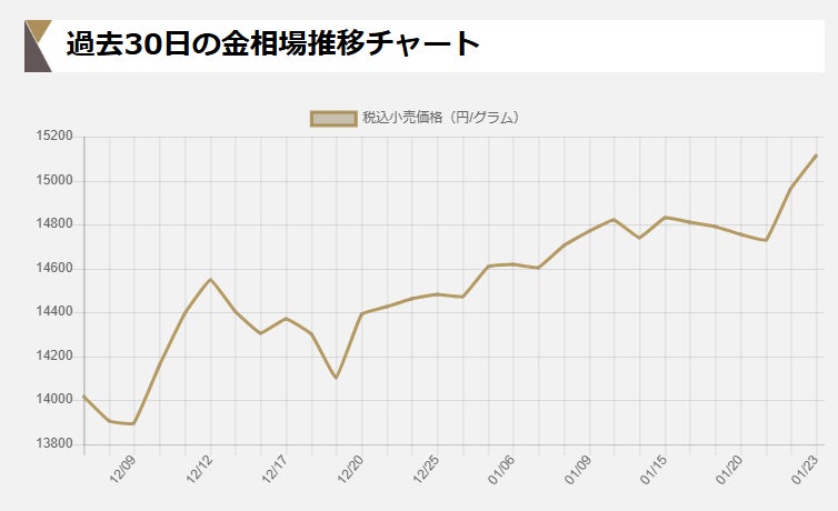 本日、1月23日(木)の金相場は前日比で+149円の続伸。昨年10月31日以来となる金価格史上最高価格が更新されました。1gあたりの金価格は15,113円です。1月20日(月)にアメリカのトランプ大統領が就任。第二次トランプ政権が始まると、早速メキシコやカナダに25%の関税が発表されると今度は中国や欧州連合(EU)への関税も課すことが宣言されました。これらへの対処と備えとして安全資産である金の需要が高まったことが金相場を押し上げる要因となりました。