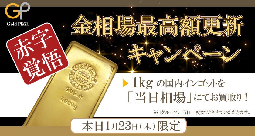 ゴールドプラザでは今回の史上最高価格更新を記念し、1月23日限定企画としてインゴット1kgを金相場100%でのお買取キャンペーンを設けさせて頂きました。1日限定の大変お得な内容となっております。これを機にインゴットのご売却をご検討されている方には是非、全国のゴールドプラザへご相談くださいませ。