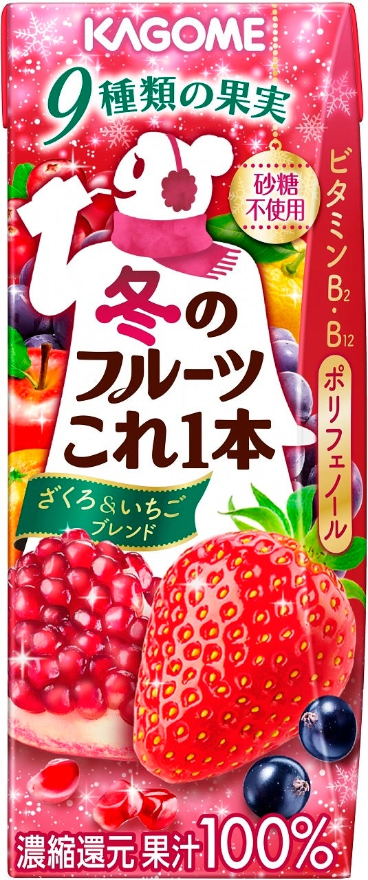 「冬のフルーツこれ一本 ざくろ&いちごブレンド」は、ざくろといちご等、9種類の果実をブレンドした冬限定の甘酸っぱい味わいの100%果実ミックスジュースです。ポリフェノールとたっぷりビタミンB2、B12を摂ることができます。