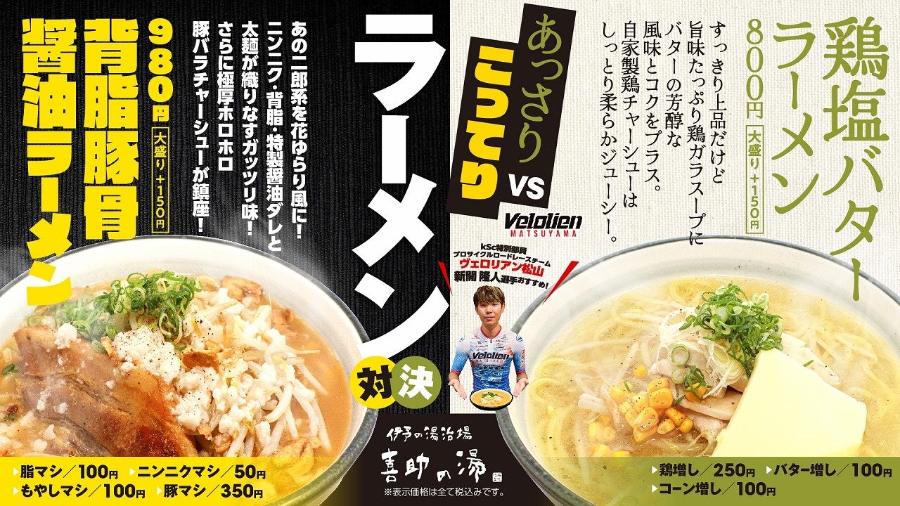 vsサ飯シリーズ第3弾 【豚骨醤油Vs鶏塩バター】ラーメンが新登場!【愛媛県・喜助の湯】