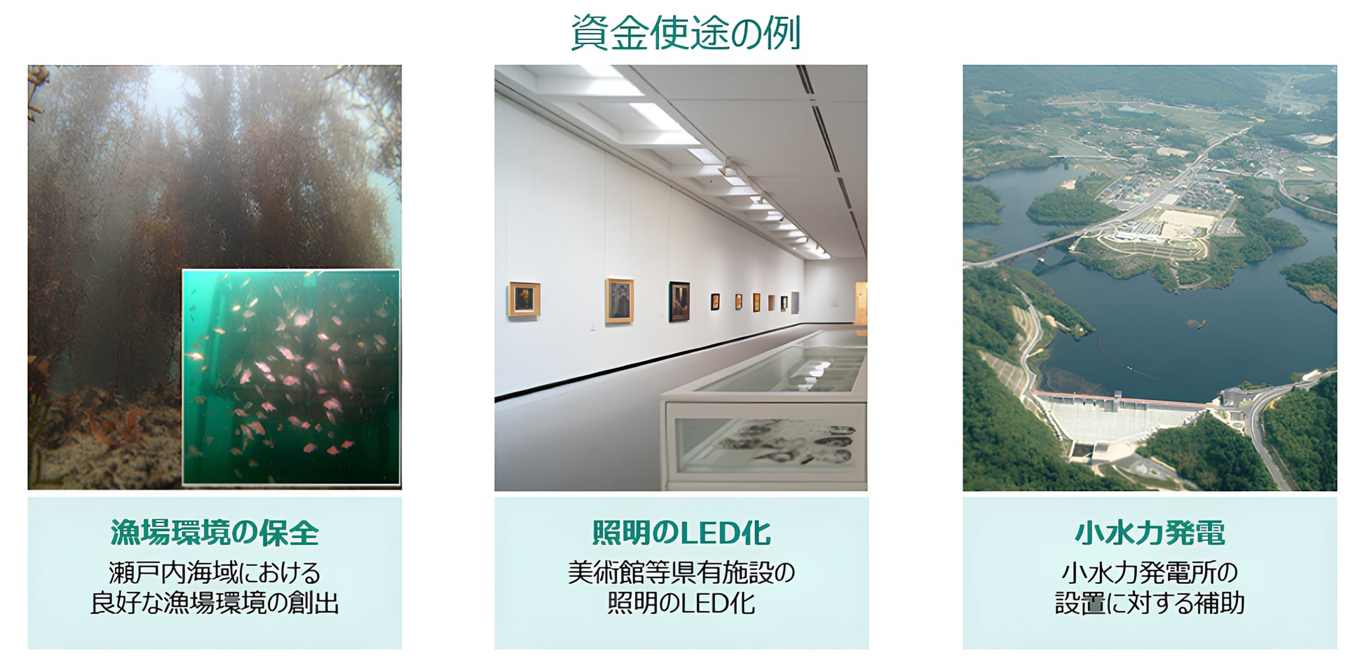 本債券により調達された資金は、瀬戸内海の良好な漁場環境の創出、エネルギー高効率な県有施設の整備、気候変動に対応するための河川改修等の環境プロジェクトに充当されます。