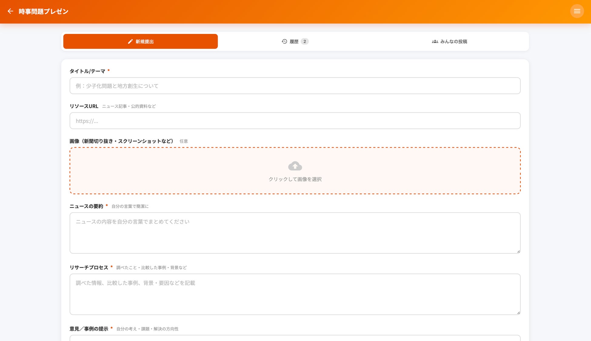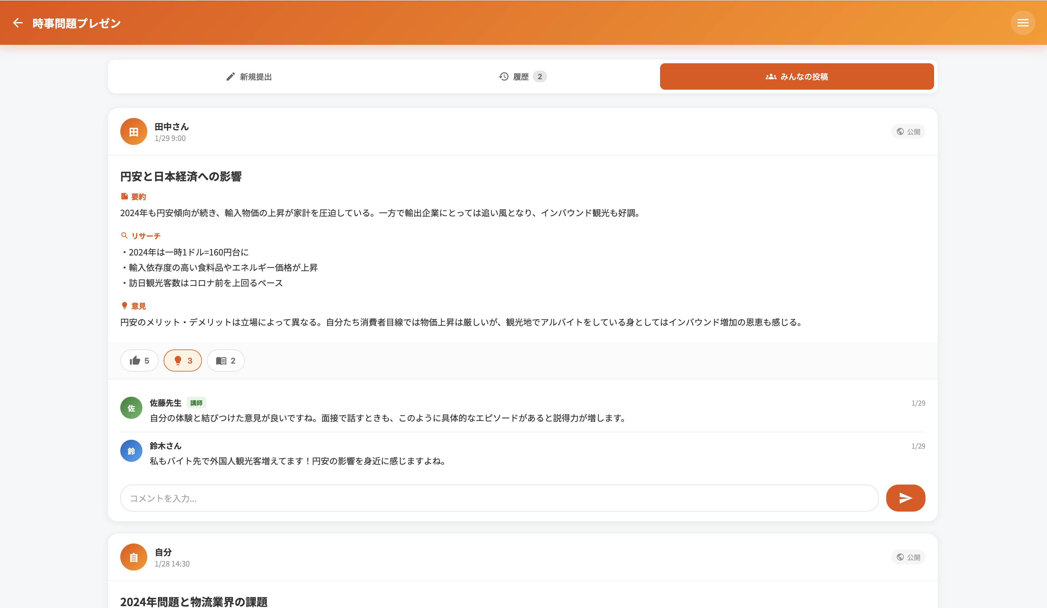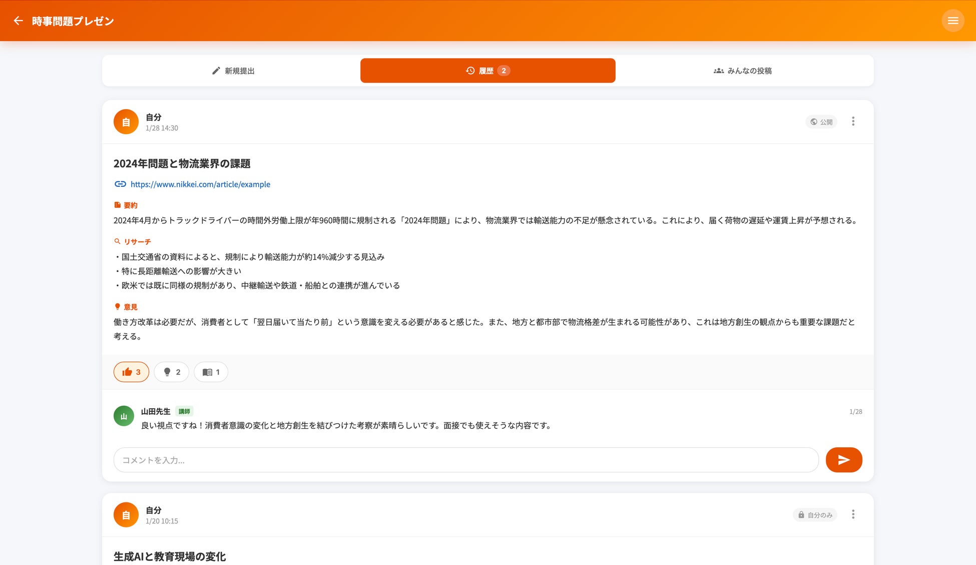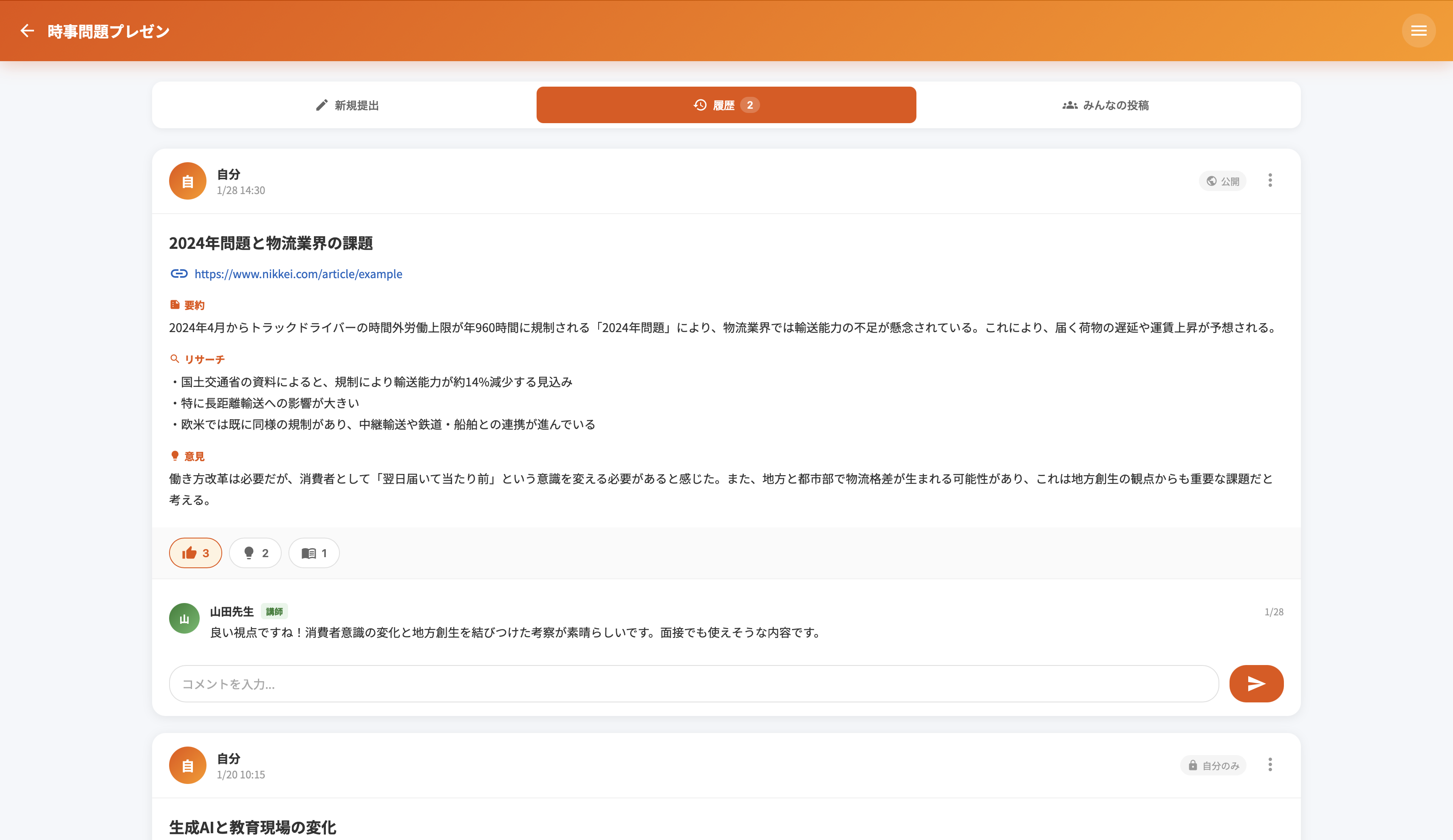 本機能は、総合型選抜専門塾EQAOで実際に行われている「時事問題プレゼン授業」のノウハウをシステム化したものです。