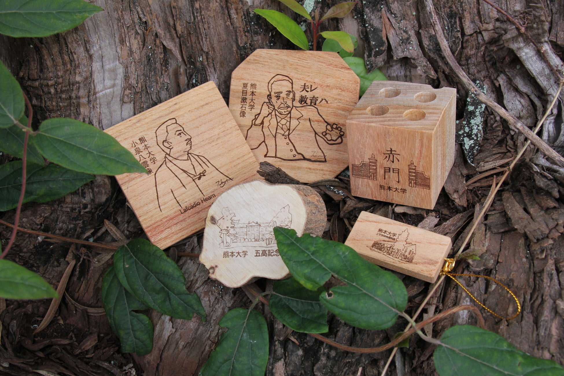 「くまだいの木」グッズは、大学内の熊本大学生活協同組合売店で令和7年4月4日(金)から販売を開始しているほか、来月以降、熊本空港に隣接する「くまもとSDGsミライパーク」での販売を予定しております。本学にゆかりのある人物や歴史的建造物等のイラスト等を、レーザー加工によって丁寧に焼き付けております。木の温もりを感じられる商品に仕上がっていますので、是非手に取っていただき、本学の想いとともに、未来への一歩を感じていただければ幸いです。