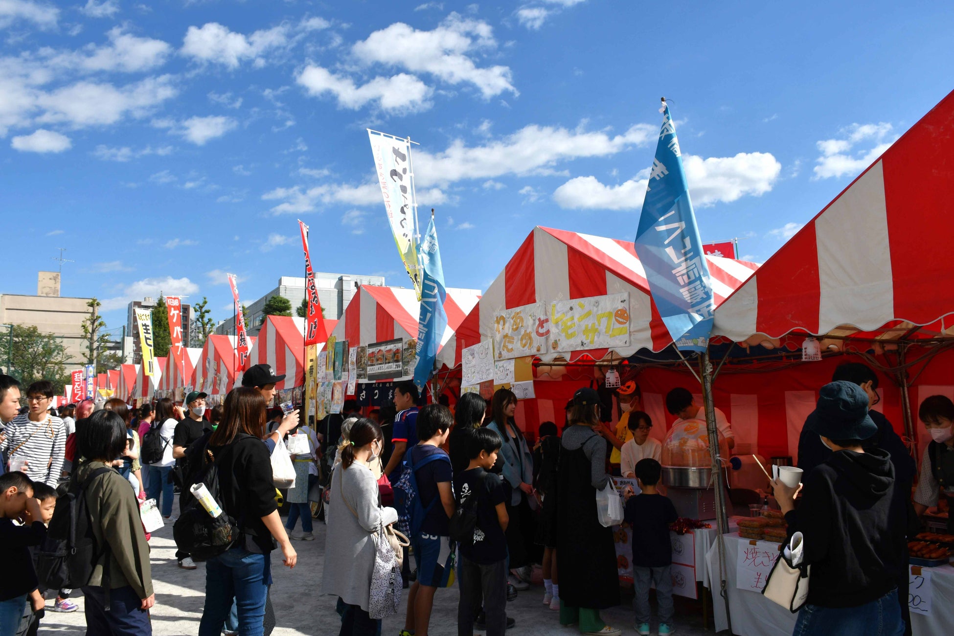 およそ100軒のテントでにぎわう大市場。区内の名店や板橋のいっぴん、友好交流都市の名物や公募によるお店のほか、いたばしPayに関するコーナーも立ち並びます。