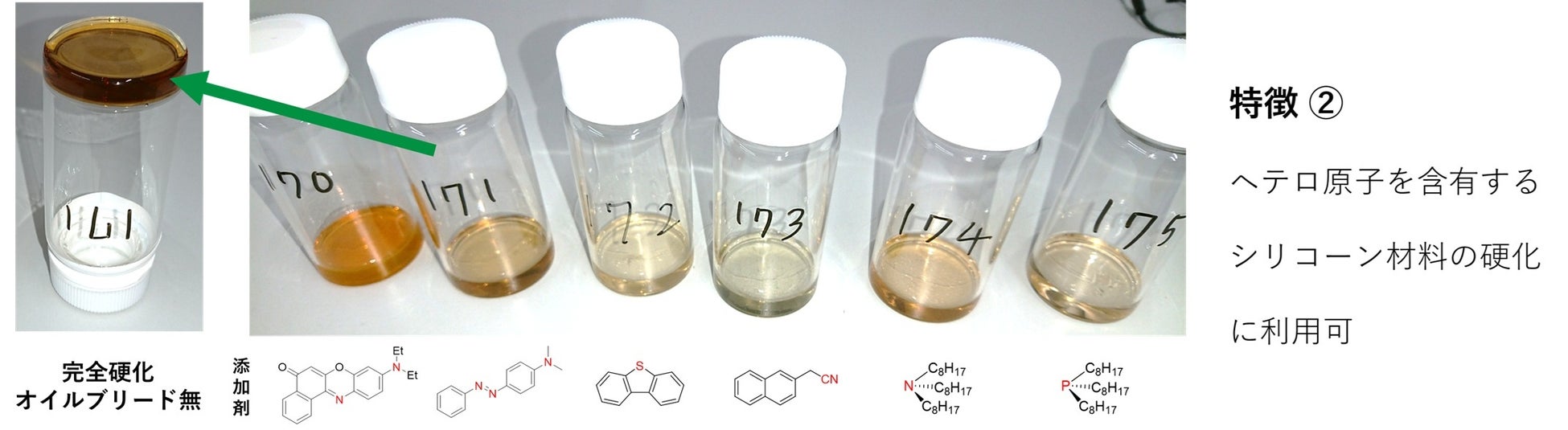 今回開発した鉄触媒のヘテロ原子を含有するシリコーン材料の硬化を検証するため、さまざまな窒素、リン、硫黄を含む化合物をシリコーン材料に添加して、シリコーンの硬化試験を行いました。いずれの添加剤を含むシリコーンも問題なく硬化が進行し、鉄触媒が白金触媒では製造困難なシリコーン材料の製造に利用可能であることを実証しました。