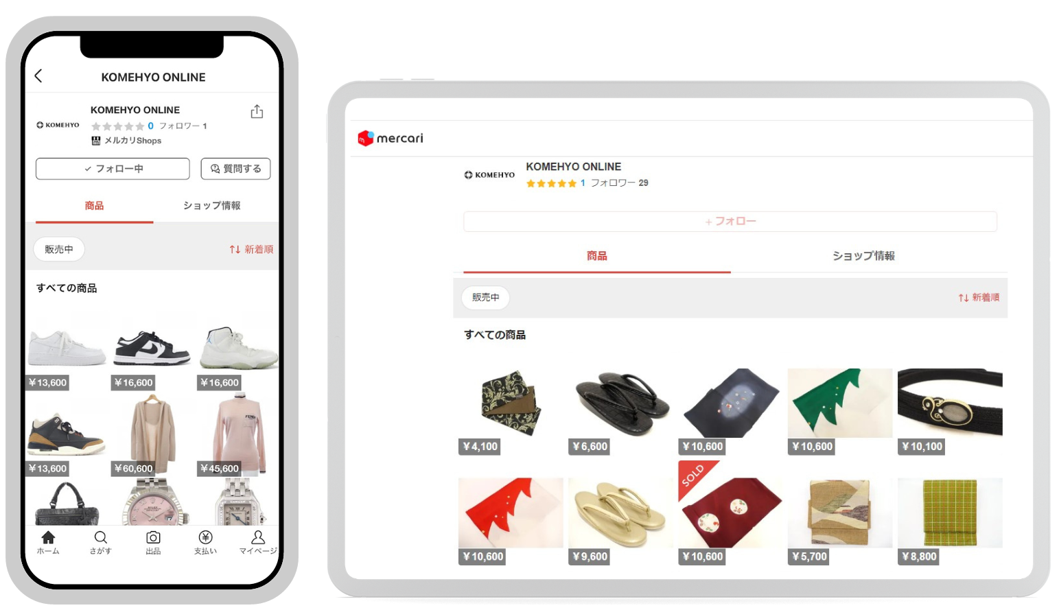 この度、KOMEHYOは「メルカリShops」に出店することにより、2,300万人の「メルカリ」のお客さまへKOMEHYO品質をお届けするとともに、①近年、成長を続けるインターネット上のCtoC市場に深く関与して、これまで以上に多くの人にインターネット上でKOMEHYOとの接点を持ってもらうこと、②「メルカリ」のボリュームゾーンである10代~20代、30代の若い世代にKOMEHYO品質およびKOMEHYOブランドを認知してもらうこと の二点を目指します。