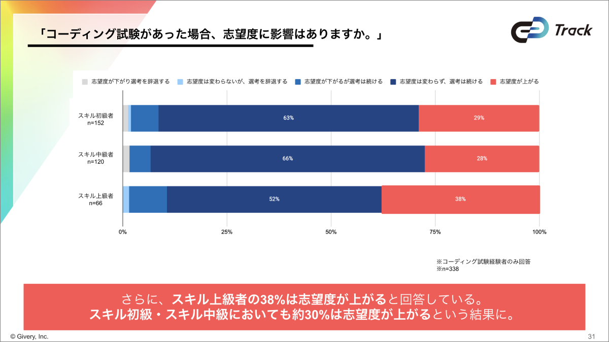 ②98%の学生は選考にコーディングテストがあっても辞退しない。そのうち30%の学生は「志望度が上がる」と回答。スキルレベルを問わずコーディングテストは志望度の向上にも好影響。