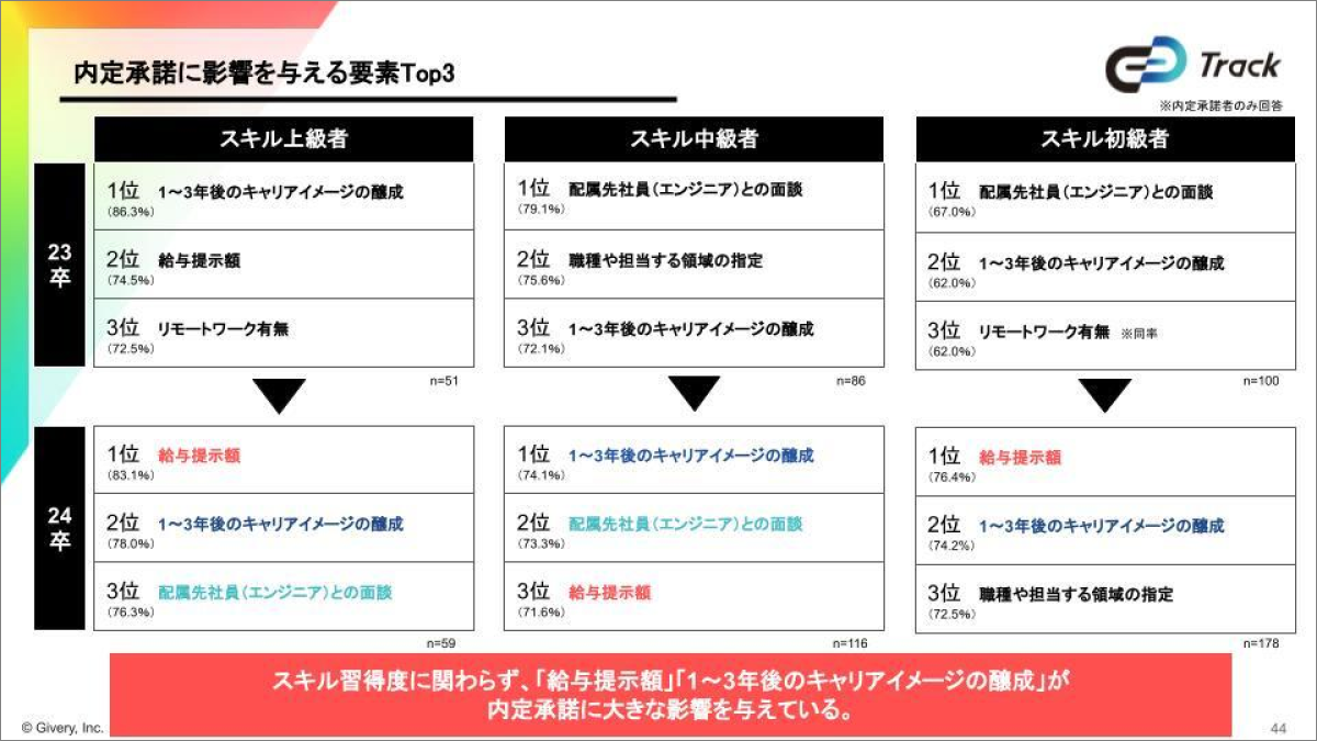 スキル上級者に限らず、初級者/中級者を採用する場合でも、職種や配属先の確約などの採用プロセスの構築やスキルに応じた初任給のオファーが、内定承諾を得るための重要な要素であると考えられます。