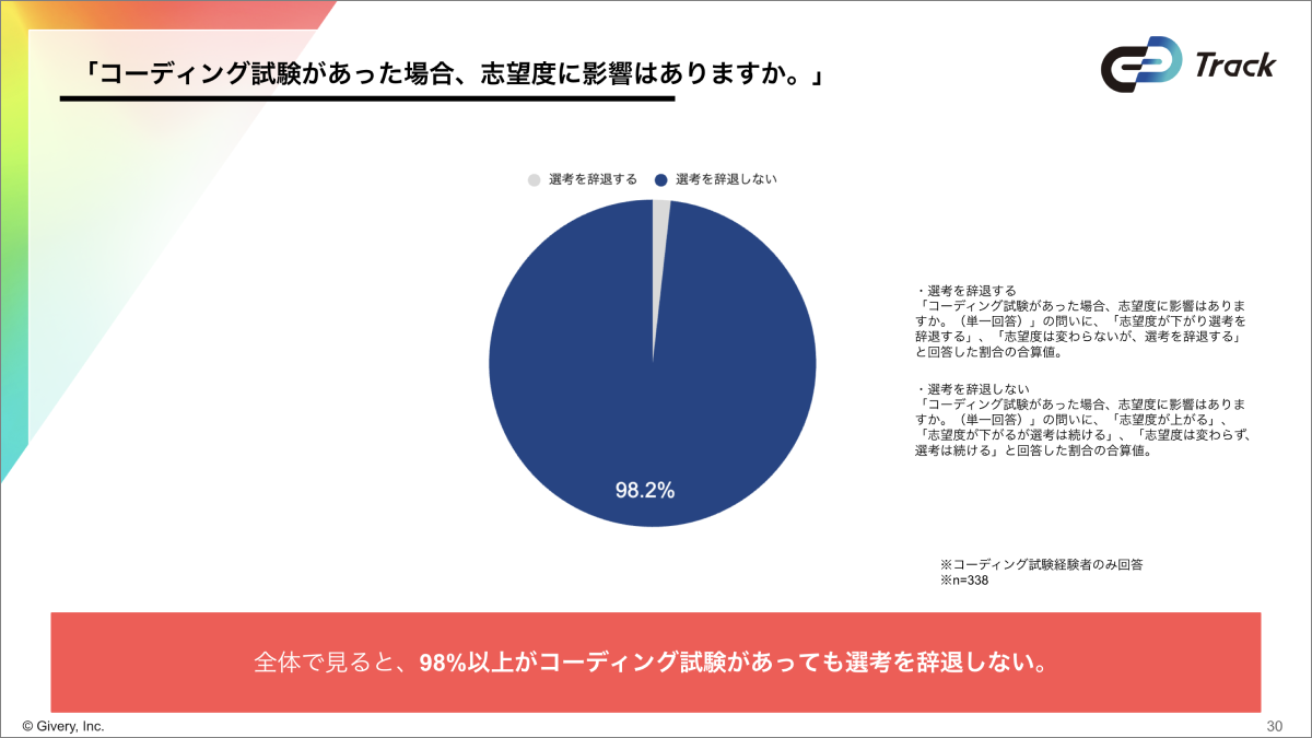 ・「選考にコーディング試験があっても、選考を辞退しない」と回答したエンジニア学生は約98%