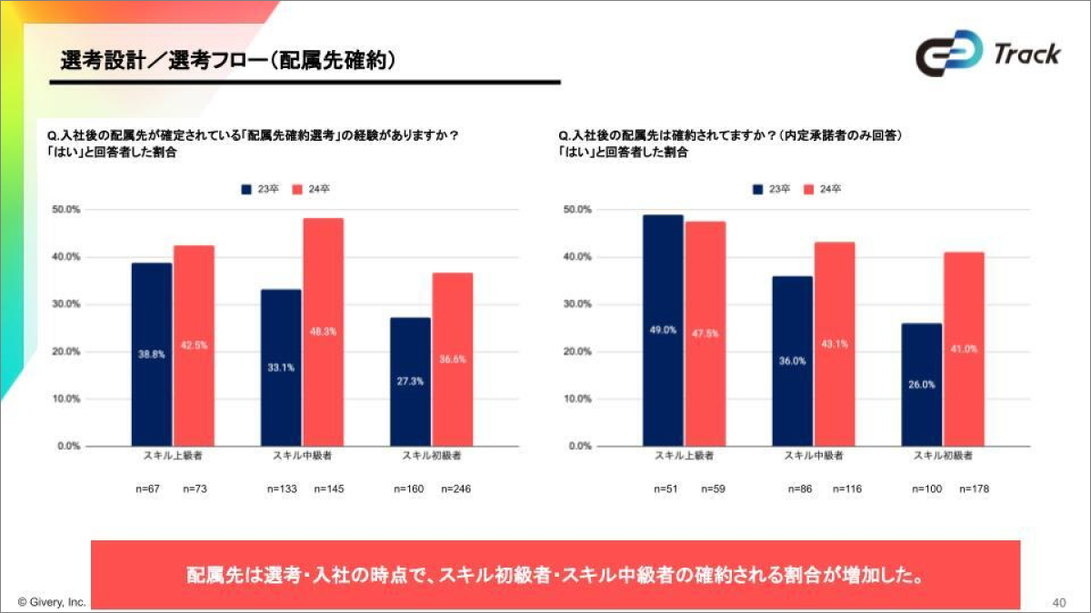 ・スキル初級者・スキル中級者の入社後の配属先が確約される割合が、昨年よりも増加した