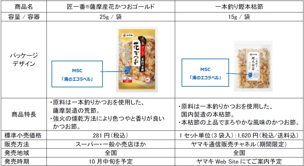 ヤマキ株式会社(本社:愛媛県伊予市 代表取締役社長:城戸善浩)は、SDGs・持続性のある水産原料調達への貢献を目指して、家庭用のかつお節商品として世界初(※)となるMSC「海のエコラベル」付き商品「匠一番®薩摩産花かつおゴールド」と「一本釣り鰹本枯節」を発売します。
