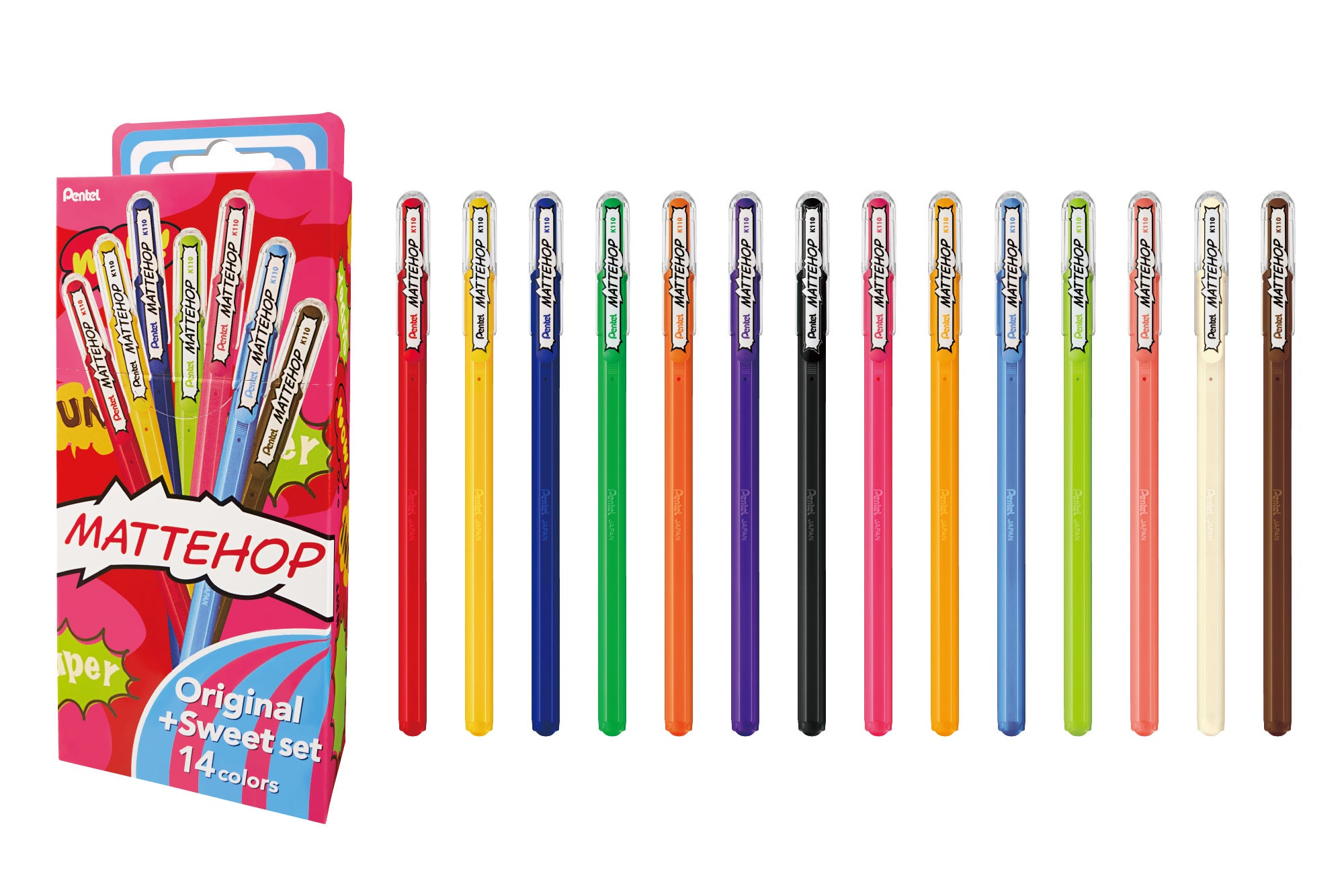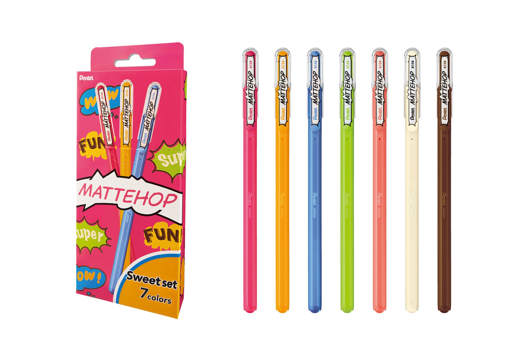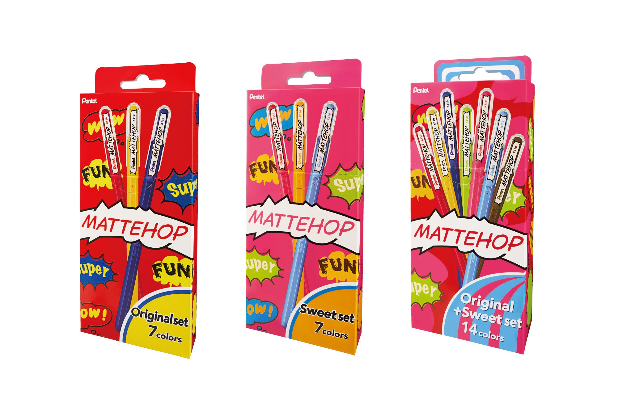 「MATTEHOP(マットホップ)」は、存在感のあるイラストや文字を描くことができる新開発のマットカラーのゲルインキボールペンです。カラーペーパーや写真、マスキングテープにも濃く鮮やかに発色し、インパクトのあるデコレーションが楽しめる全14色展開で、7色セット2種類と14色セット、計3種類のセットを同時発売します。