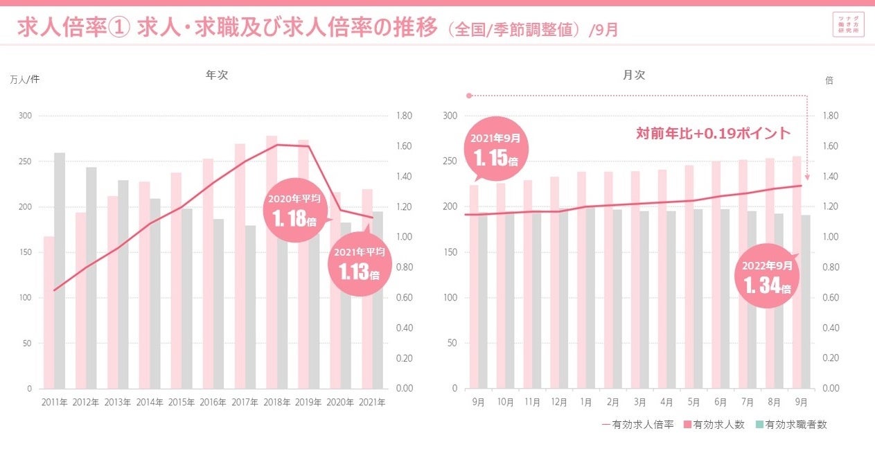 2022年9月度の有効求人倍率は1.34倍。完全失業率は2.6% 労働市場データレポート(2022年9月度版)