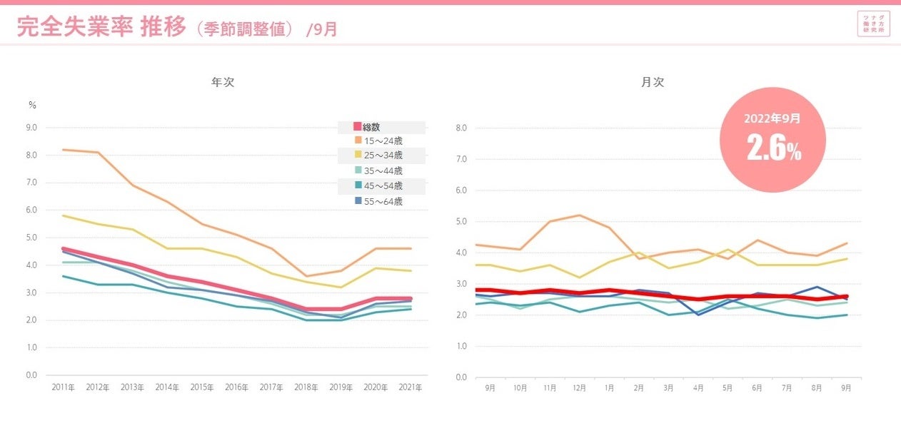 多様な働き方の調査研究機関「ツナグ働き方研究所(拠点:東京都千代田区/所長:平賀充記)」は、官公庁などが発表する労働市場関連のデータをキュレーションしつつ、分かりやすくまとめた「労働市場データレポート」を毎月発表していきます。今回は10月下旬に発表された最新データをもとに2022年9月度レポートについて、とりまとめましたのでご報告いたします。