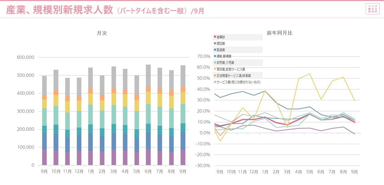 新規求人数は、前年同月比で+9.8%と先月(+15.1%)の伸びよりやや鈍化しました。伸び率トップ3は宿泊・飲食サービス(29.5%増)、生活関連サービス・娯楽(22.3%増)、卸・小売り(12.7%増)。サービス業は観光需要などの持ち直しで堅調に推移しています。