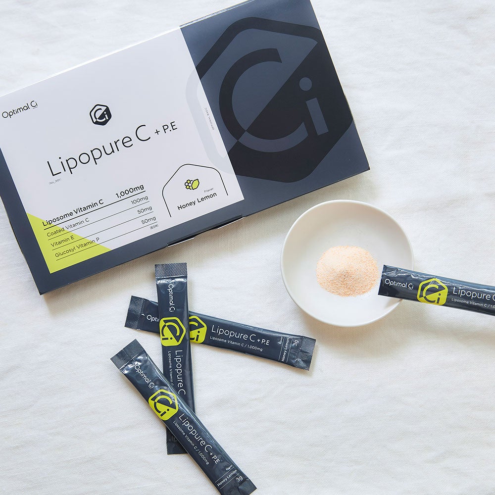 ビタミンCサプリメントのLipopureC+P.Eは、吸収力と持続力の高いリポソーム型ビタミンCを1,000mg配合し、さらにビタミンCをサポートする3つの成分を加えています。