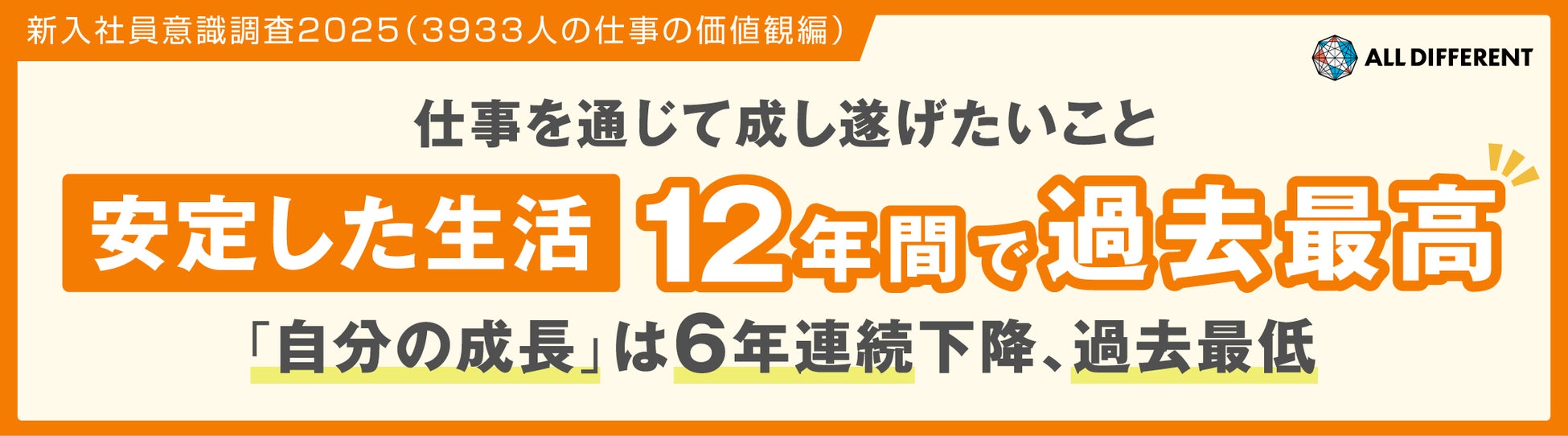 累計20,000社420万人以上の組織開発・人材育成を支援するALL DIFFERENT(オールディファレント)株式会社(所在地:東京都千代田区 代表取締役社長:眞﨑大輔)および「人と組織の未来創り🄬」に関する調査・研究を行うラーニングイノベーション総合研究所🄬は、2025年3月25日~4月24日の期間で、2025年度入社の新入社員 3,933人を対象に「新入社員意識調査」を行いました。本リリースでは、4月に入社を迎えた新入社員の仕事への価値観に関する調査結果を公表いたします。