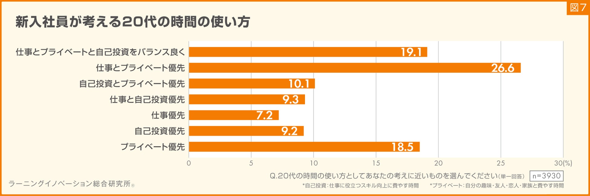 次に、新入社員が考える20代の時間の使い方について、「仕事」「プライベート」「自己投資」の優先順位を質問しました。結果、約4人に1人が「仕事とプライベート優先」(26.6%)と回答する結果になりました。次に、「仕事とプライベートと自己投資をバランス良く」が19.1%、「プライベート優先」が18.5%と続きました(図7)。