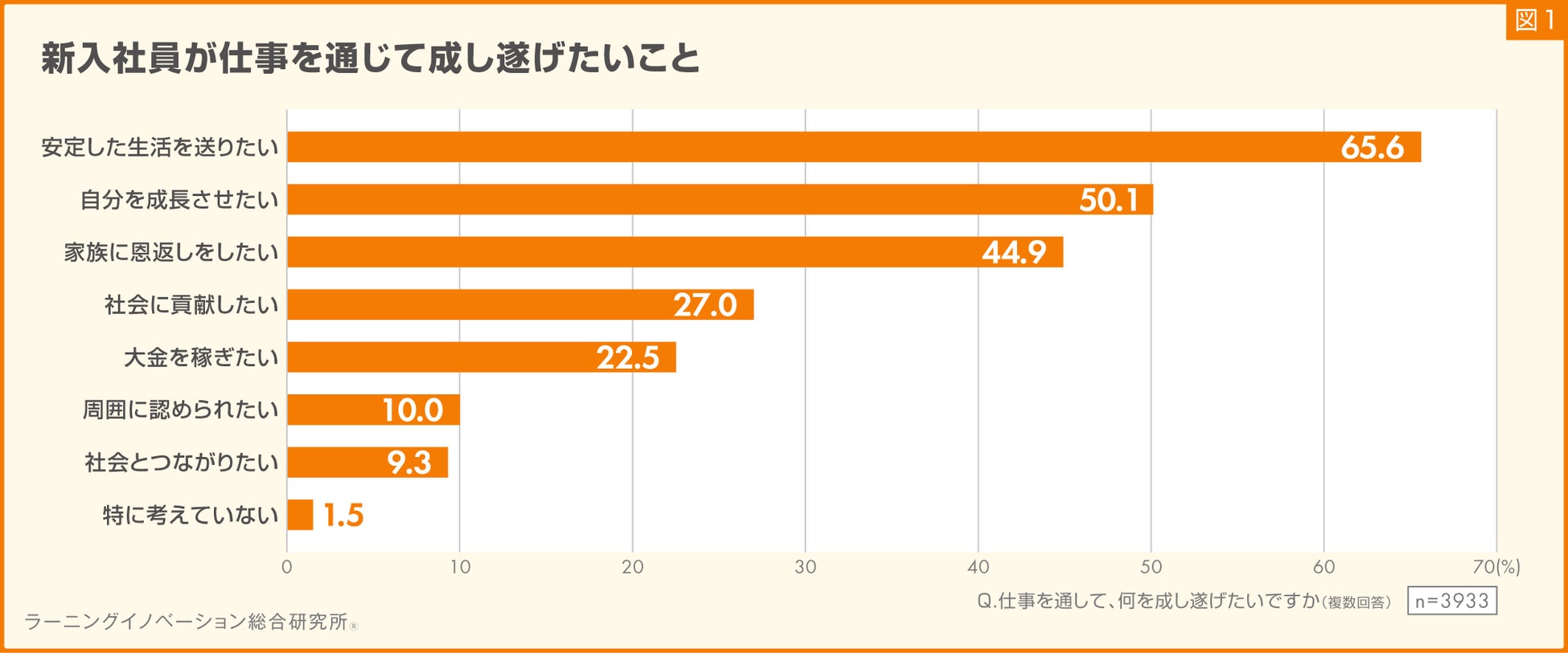 新入社員が仕事を通して成し遂げたいことについて、「安定した生活を送りたい」と考えている割合が過去最高である一方、「自分を成長させたい」と考えている割合は過去最低となりました。