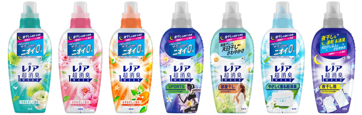 左から「レノア超消臭1WEEK みずみずしく香るフレッシュグリーンの香り」、「レノア超消臭1WEEK みずみずしく香るフローラルフルーティーソープの香り」、「レノア超消臭1WEEK みずみずしく香るシトラスの香り」、「レノア超消臭1WEEK スポーツ フレッシュシトラスの香り」、「レノア超消臭1WEEK 部屋干しおひさまの香り」、「レノア超消臭1WEEK やさしく香る超消臭 フレッシュソープの香り」「レノア超消臭1WEEK 夜干し用アクアナイトシャボンの香り」(数量限定)