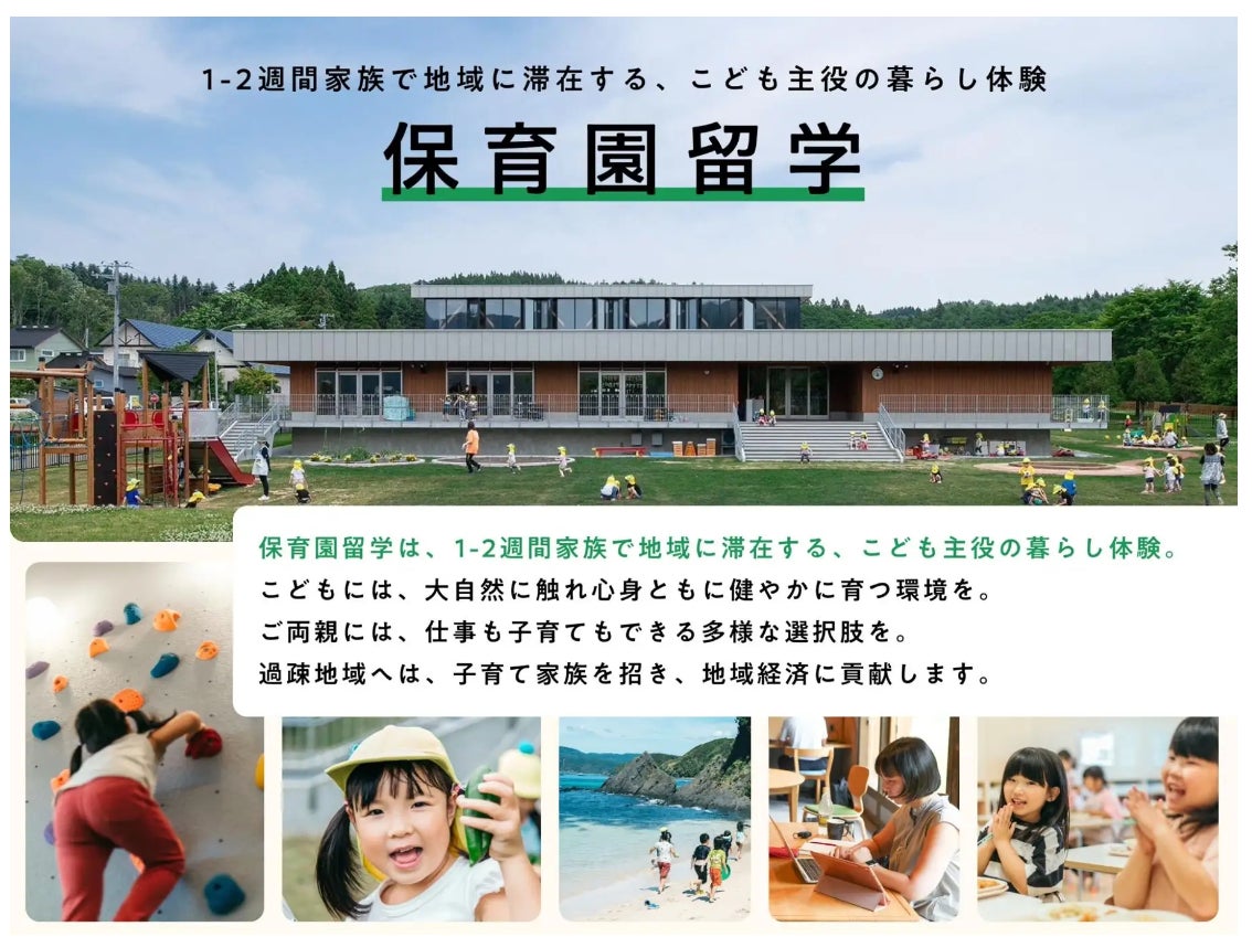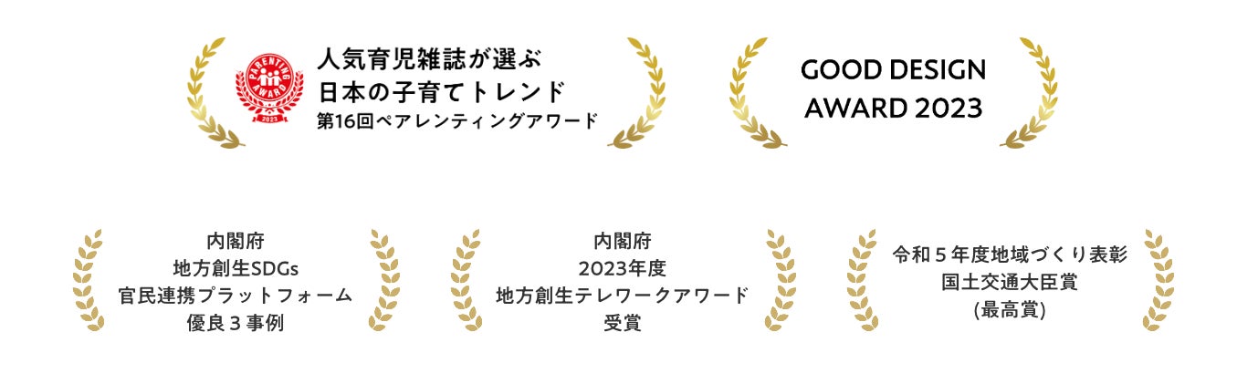 1-2週間家族で地域に滞在する、こども主役の暮らし体験「保育園留学」は人気育児雑誌が選ぶ2023年の日本の子育てトレンド「第16回 ペアレンティングアワード」、内閣府「地方創生SDGs官民連携プラットフォーム」優良3事例、内閣府「2023年度地方創生テレワークアワード・地域課題解決プロジェクト参画部門」、国土交通省「令和5年度地域づくり表彰」国土交通大臣賞(最高賞)など多数受賞。