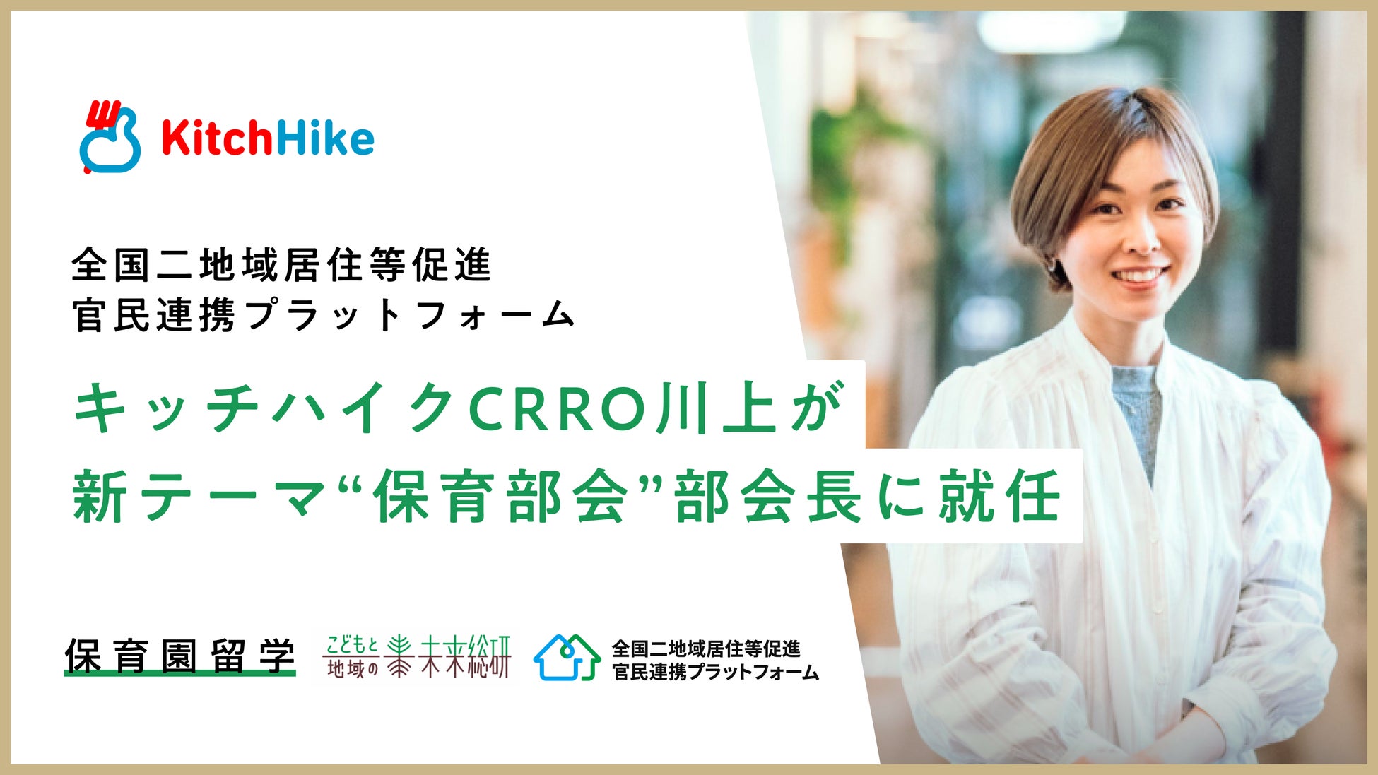 こうした取り組みが評価され、「全国二地域居住等促進官民連携プラットフォーム」に新設された“保育部会”にキッチハイクが任命され、部会長としてCRRO兼「こどもと地域の未来総研」所長の川上真生子が就任いたしました。