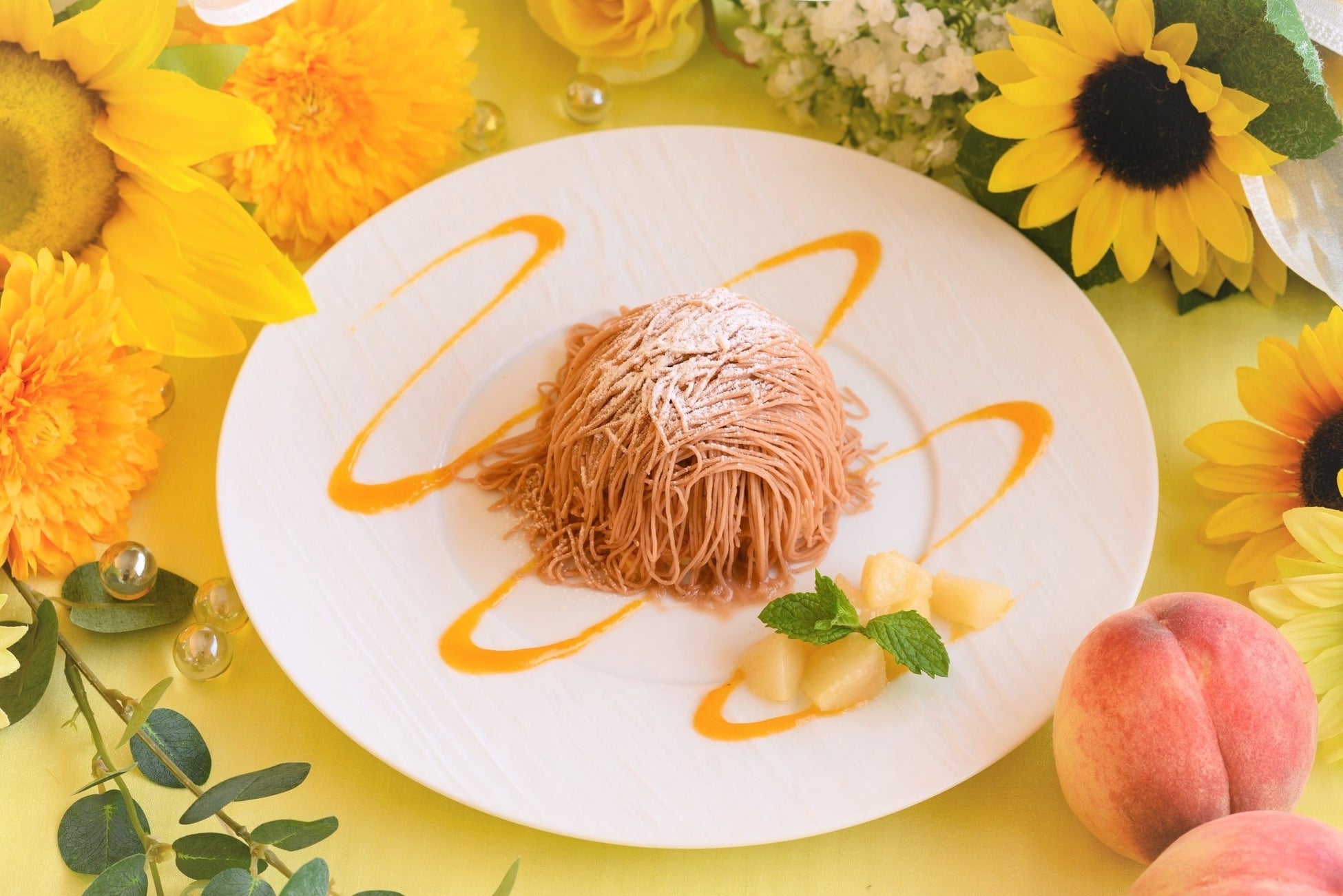 大好評の“生搾りモンブラン”を夏バージョンにリニューアル。自家製のバニラアイスと桃のコンポートをマロンクリームで包みました。コクのあるマスカルポーネクリームと甘酸っぱいフランボアワーズソースを忍ばせ、夏らしい爽やかな味わいに仕上げています。ご注文後に一つひとつ丁寧に仕上げる贅沢すぎるデザートです。