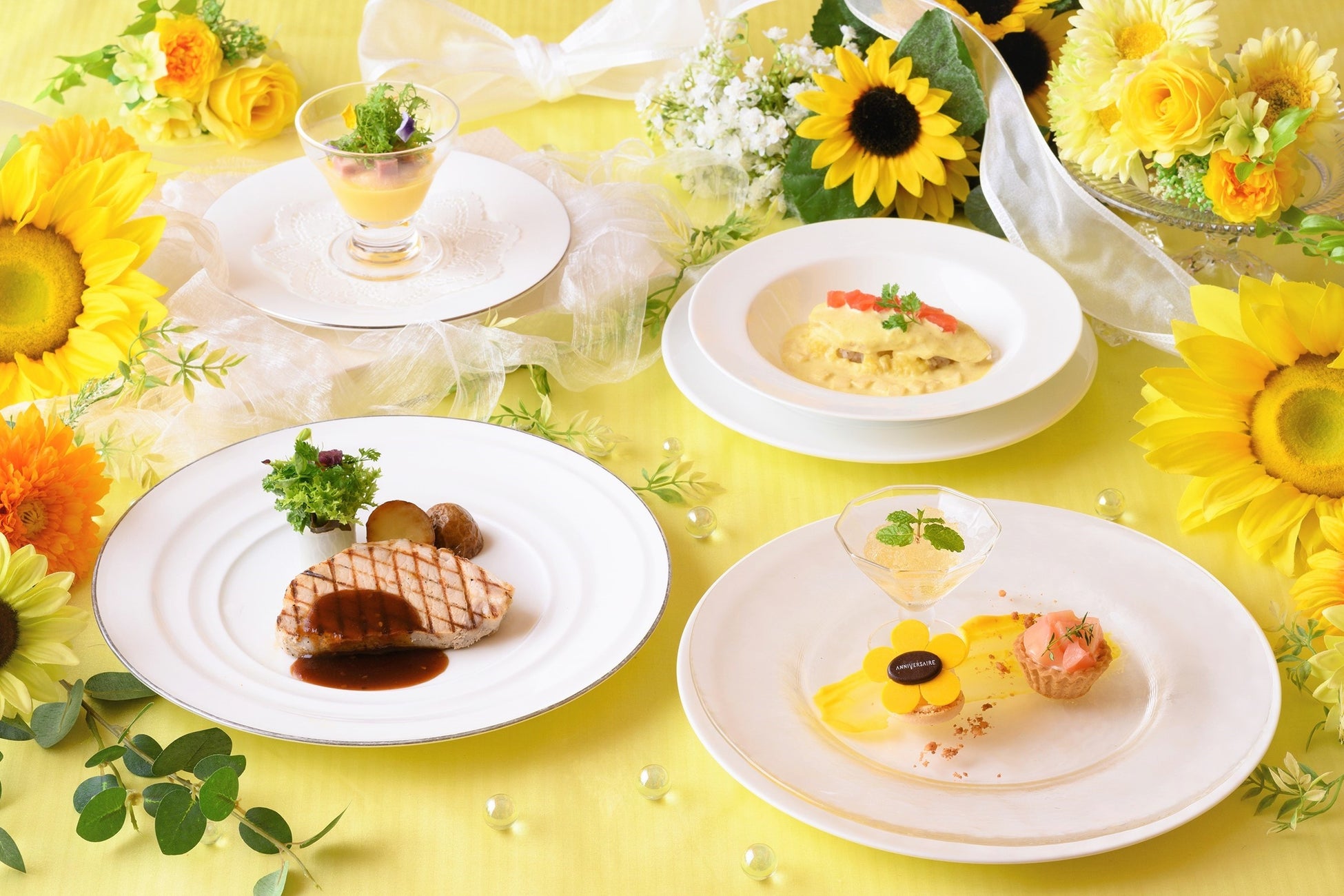夏らしいイエローカラーで彩られた「前菜」「魚料理」「肉料理」「デザート」の全4品のコースメニューをご用意いたします。ひまわりフェア限定のランチコースを、みなとみらいの運河を眺めながらゆったりとご堪能ください。